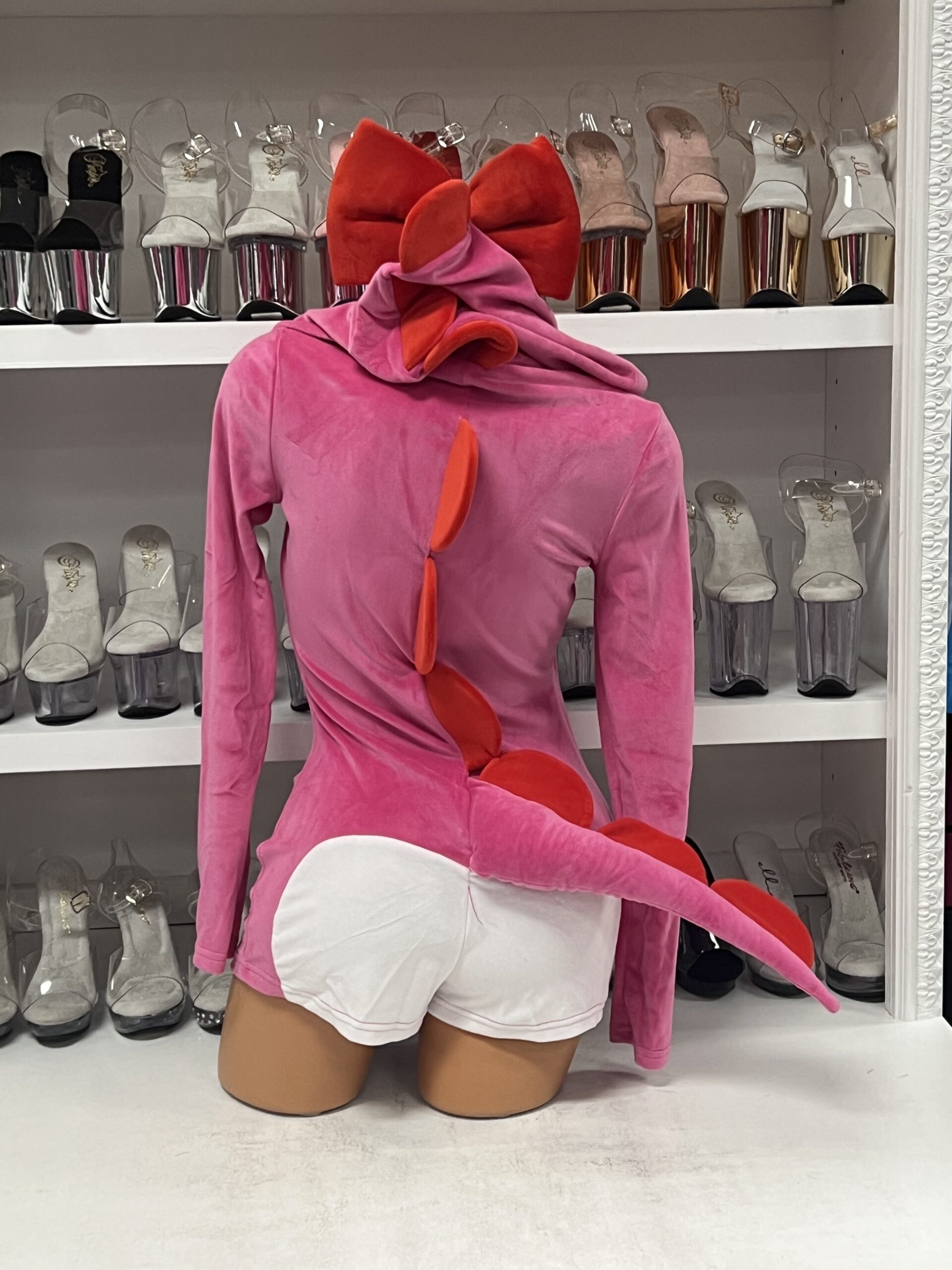 Comfy Dino Cutie Costume – pink romper outfit with dino hood and red bow, cozy one-piece Halloween or cosplay costum