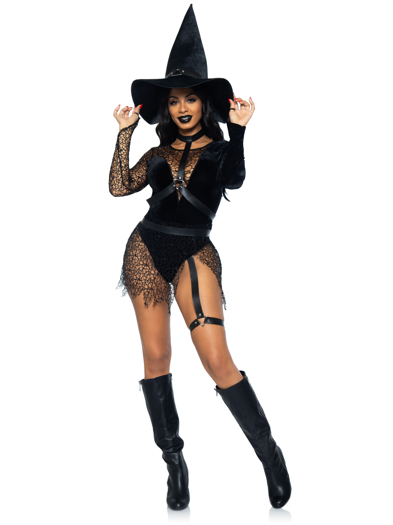 3 PC Crafty Witch, includes snap crotch velvet bodysuit with distressed net and attached garter, choker body harness, and matching velvet witch hat. No returns or exchanges.
