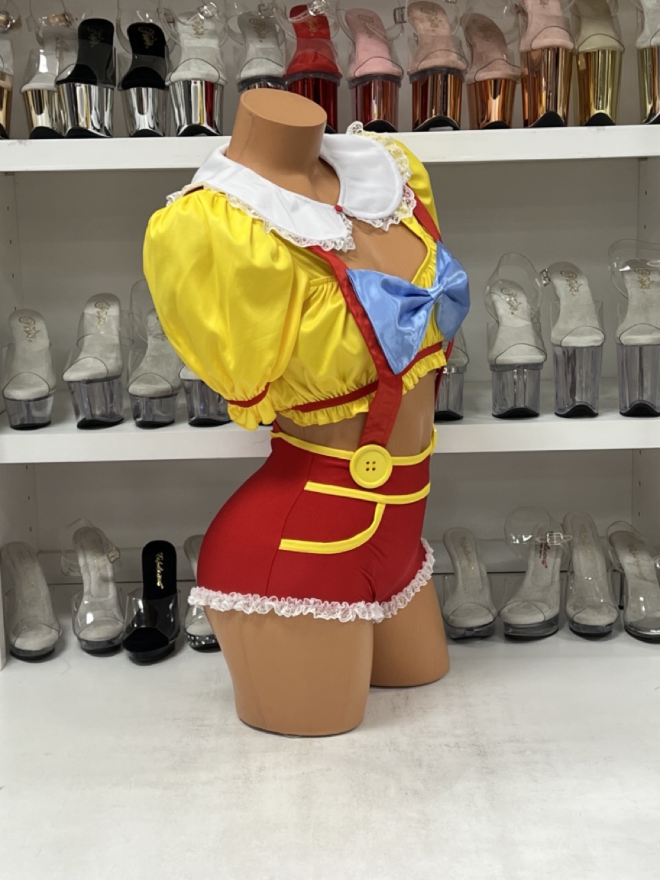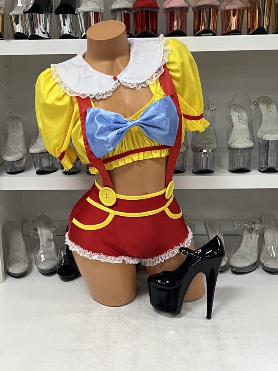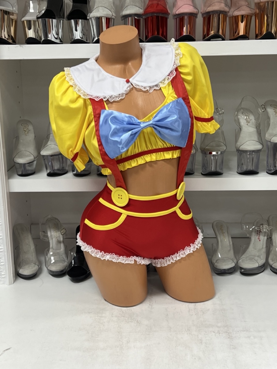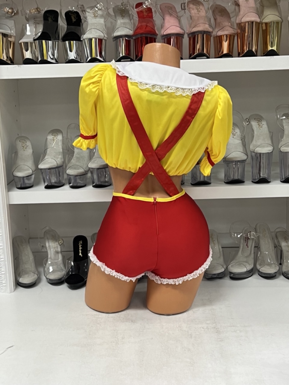Double Trouble Costume Set includes crop top, shorts, and headband. Fun, colorful design for stagewear, roleplay, or parties. Accessories sold separately.