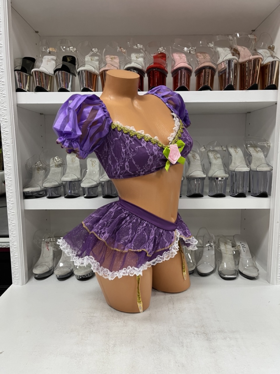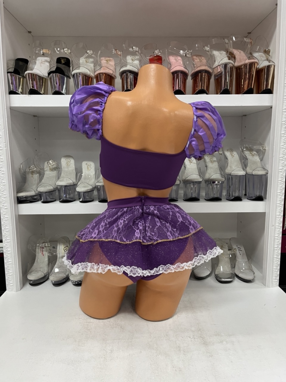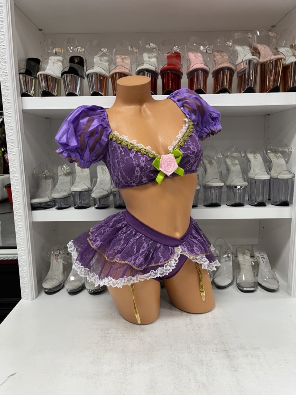 Tower Princess Costume with purple bra top, garter panty, and crown. A playful princess-inspired outfit perfect for parties and cosplay.
