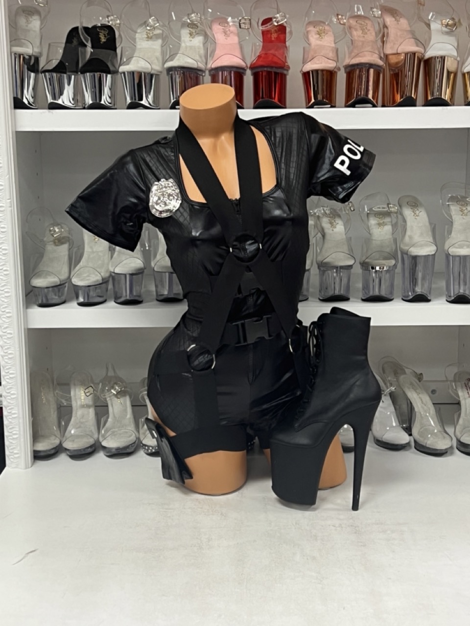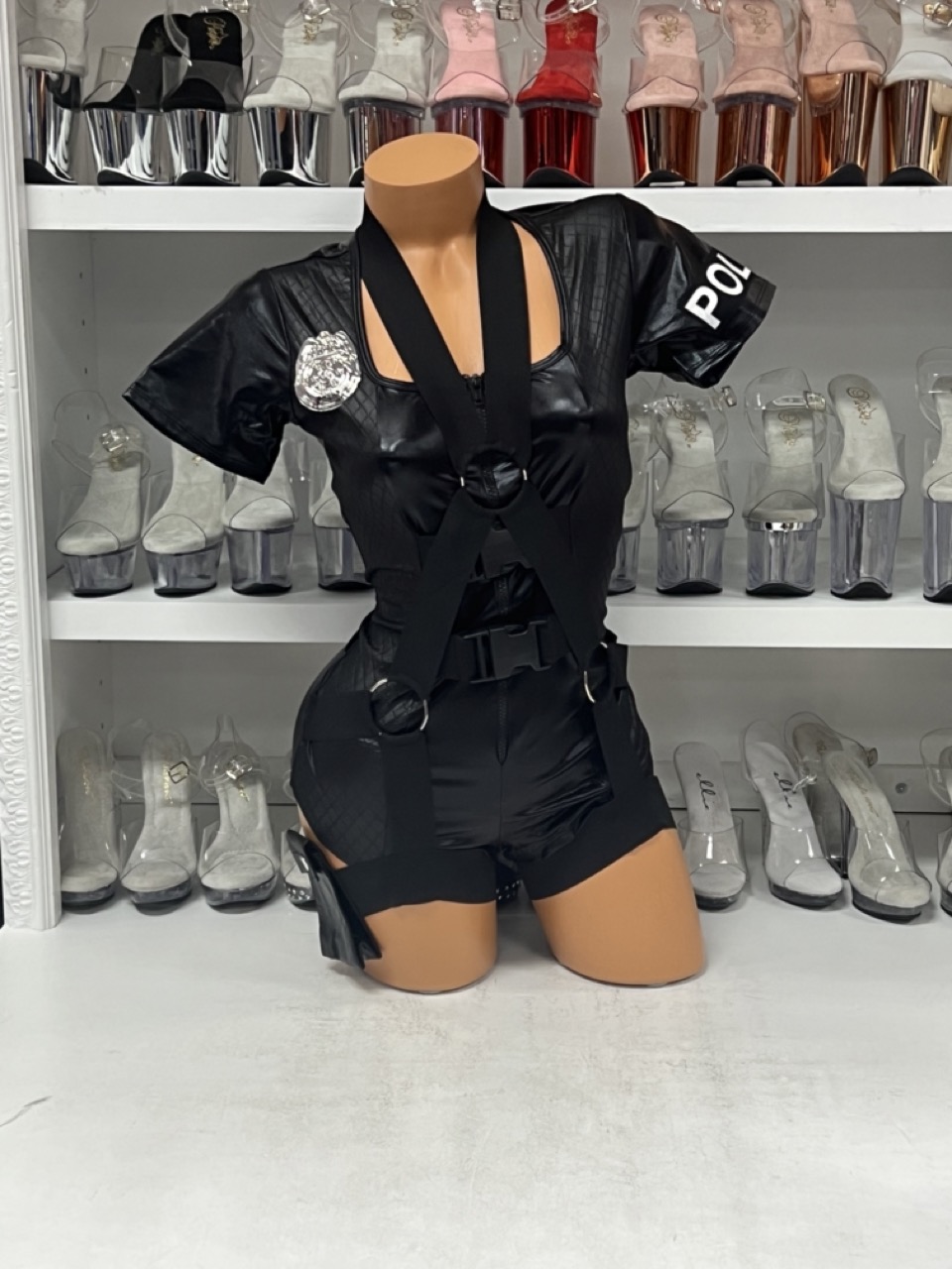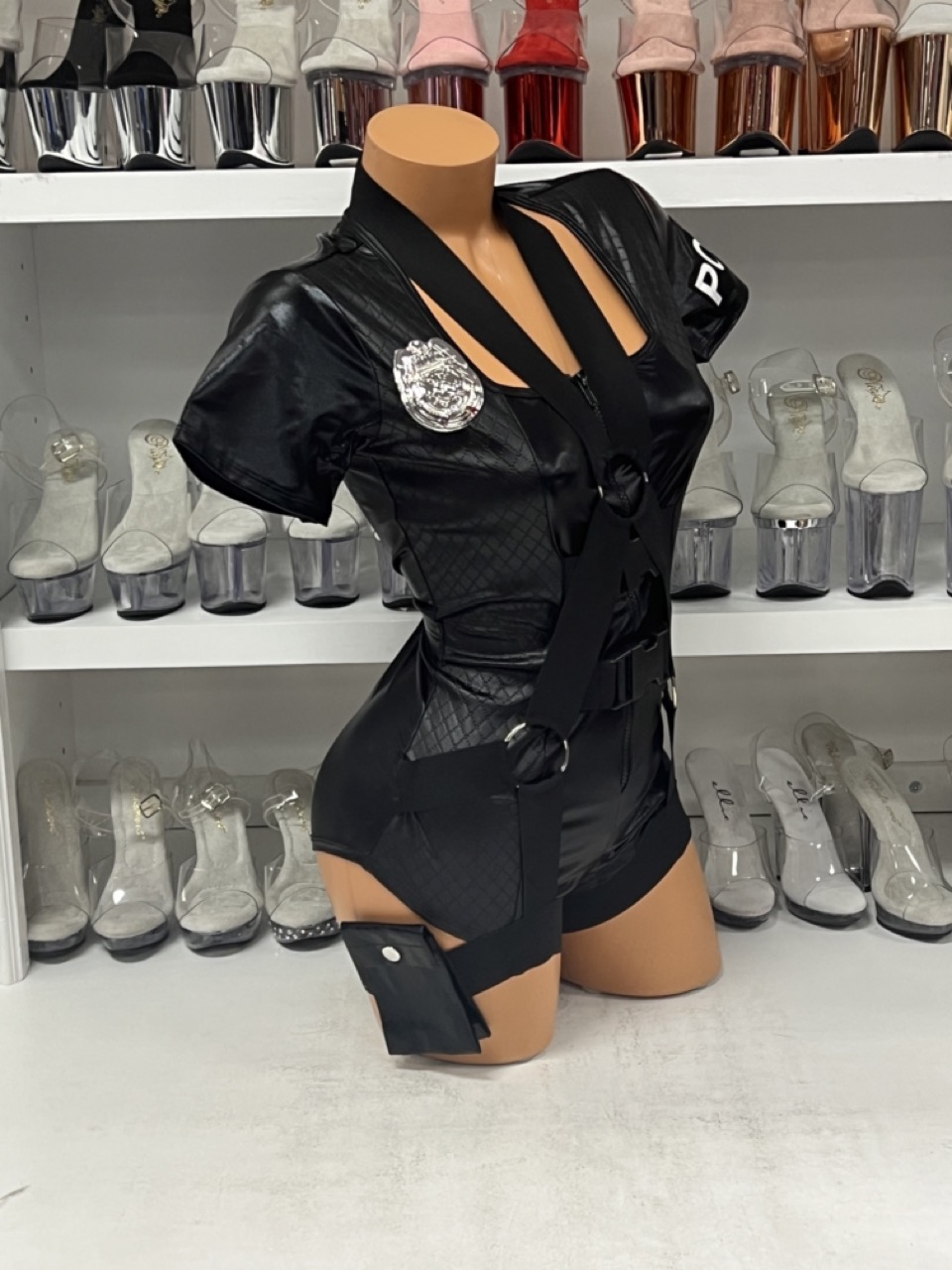 Own the night with the Flirty Five-O Costume — a 3-piece police outfit with romper, badge, and hat.