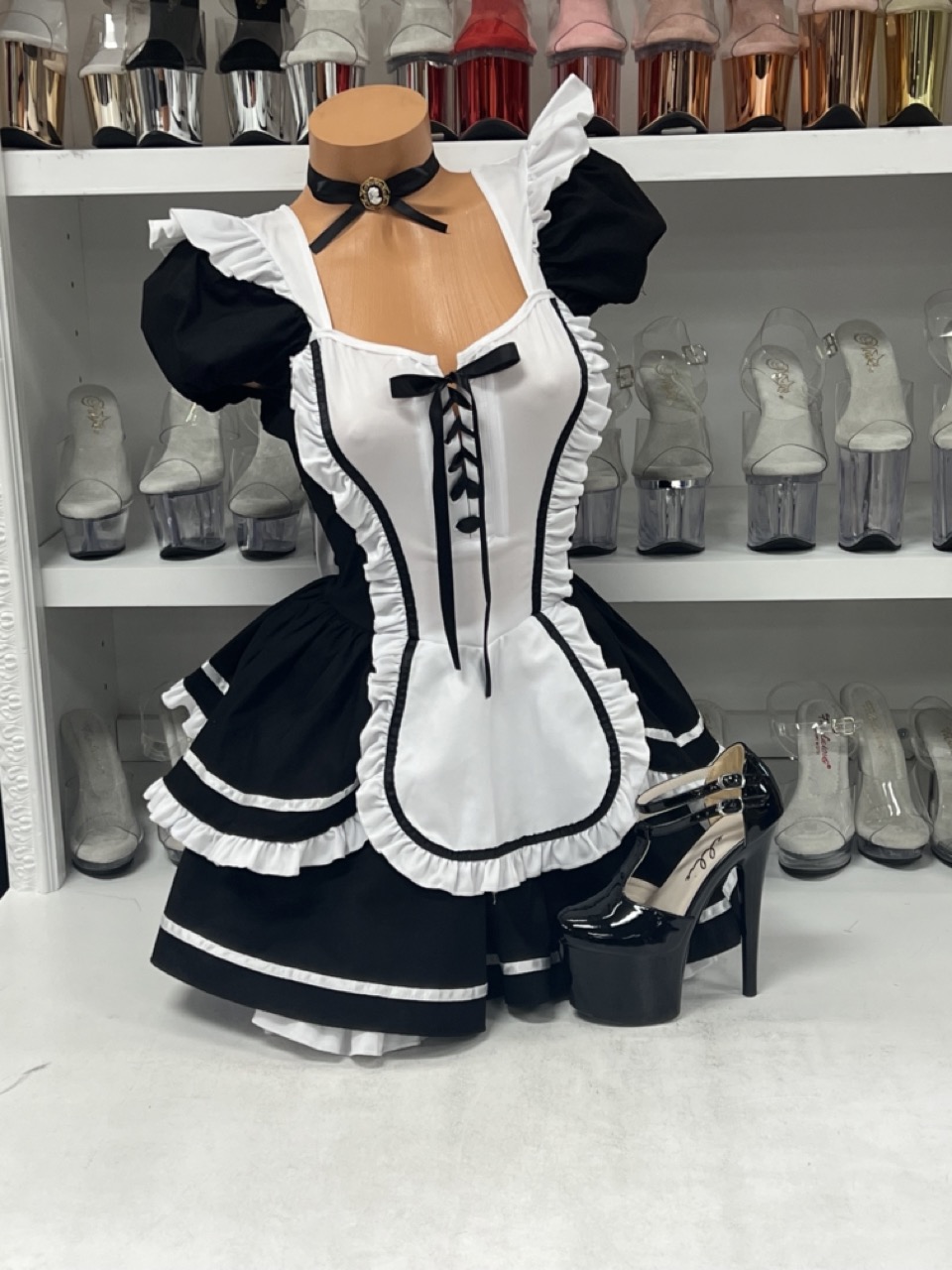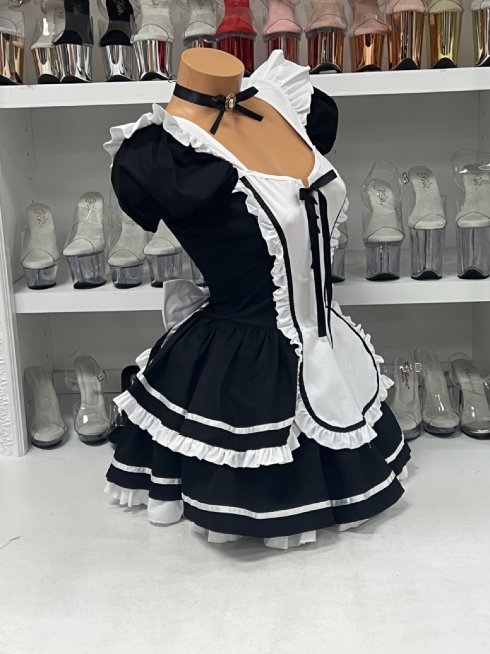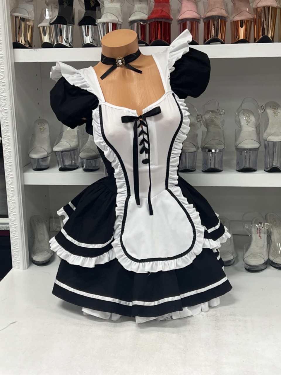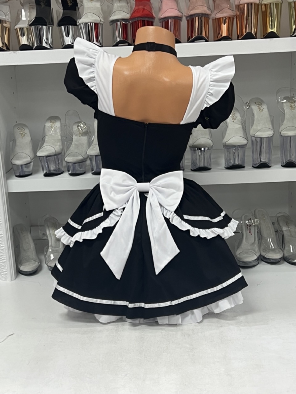 Maid to Flirt Costume includes dress, pin-on bow, lace choker, and headband.