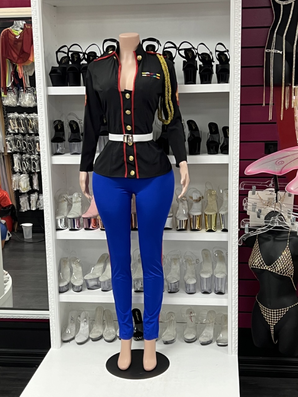 Includes Button up Jacket with Braded Aiguillette, Ranking Patch Detail, Pants and Belt No returns or exchanges.