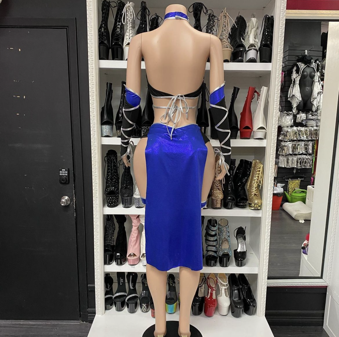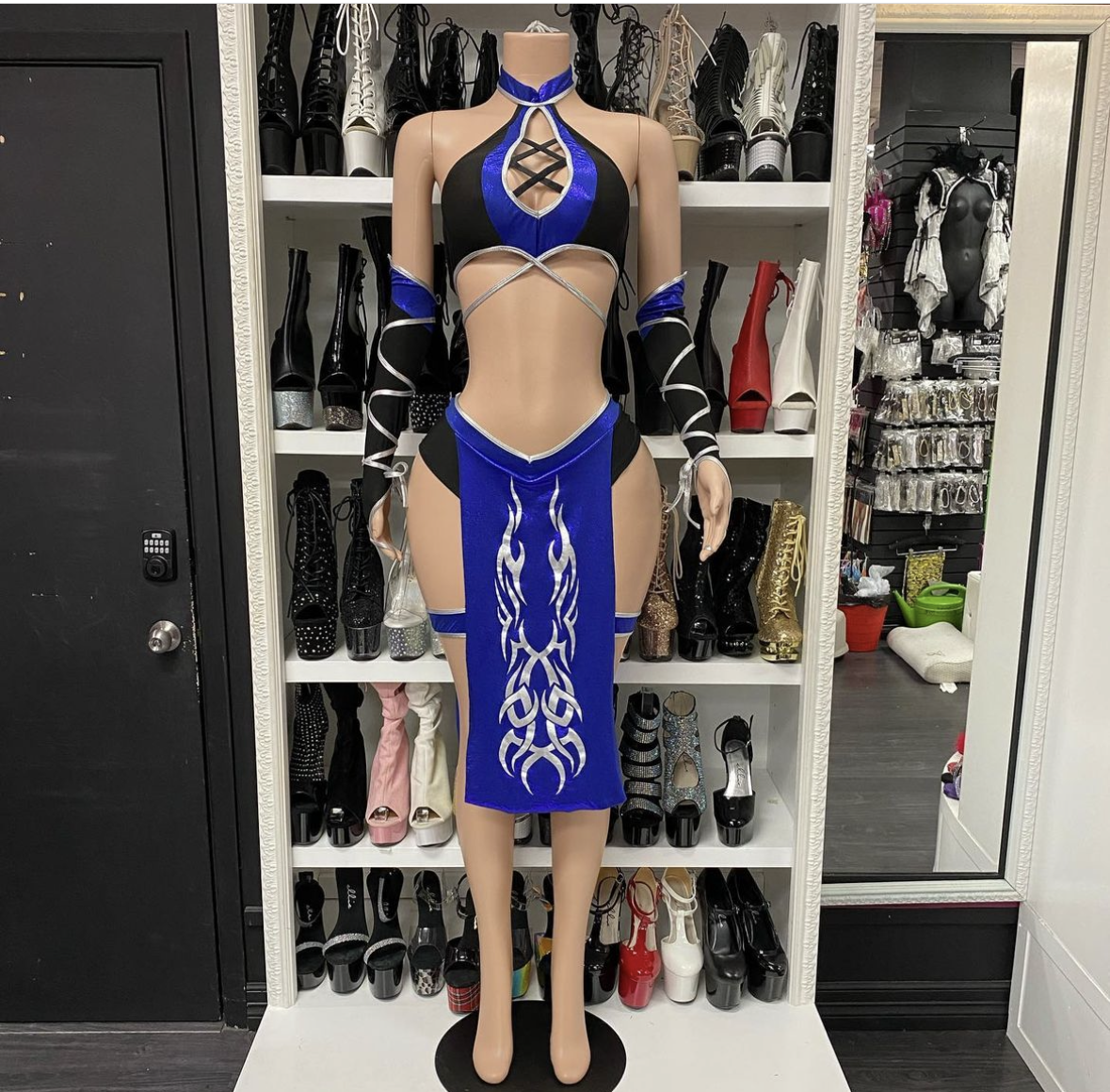 5 PC Combat Ninja, includes keyhole halter crop top, panel skirt with attached panty and garter, gauntlet gloves, face mask, and hair ties. No returns or exchanges.