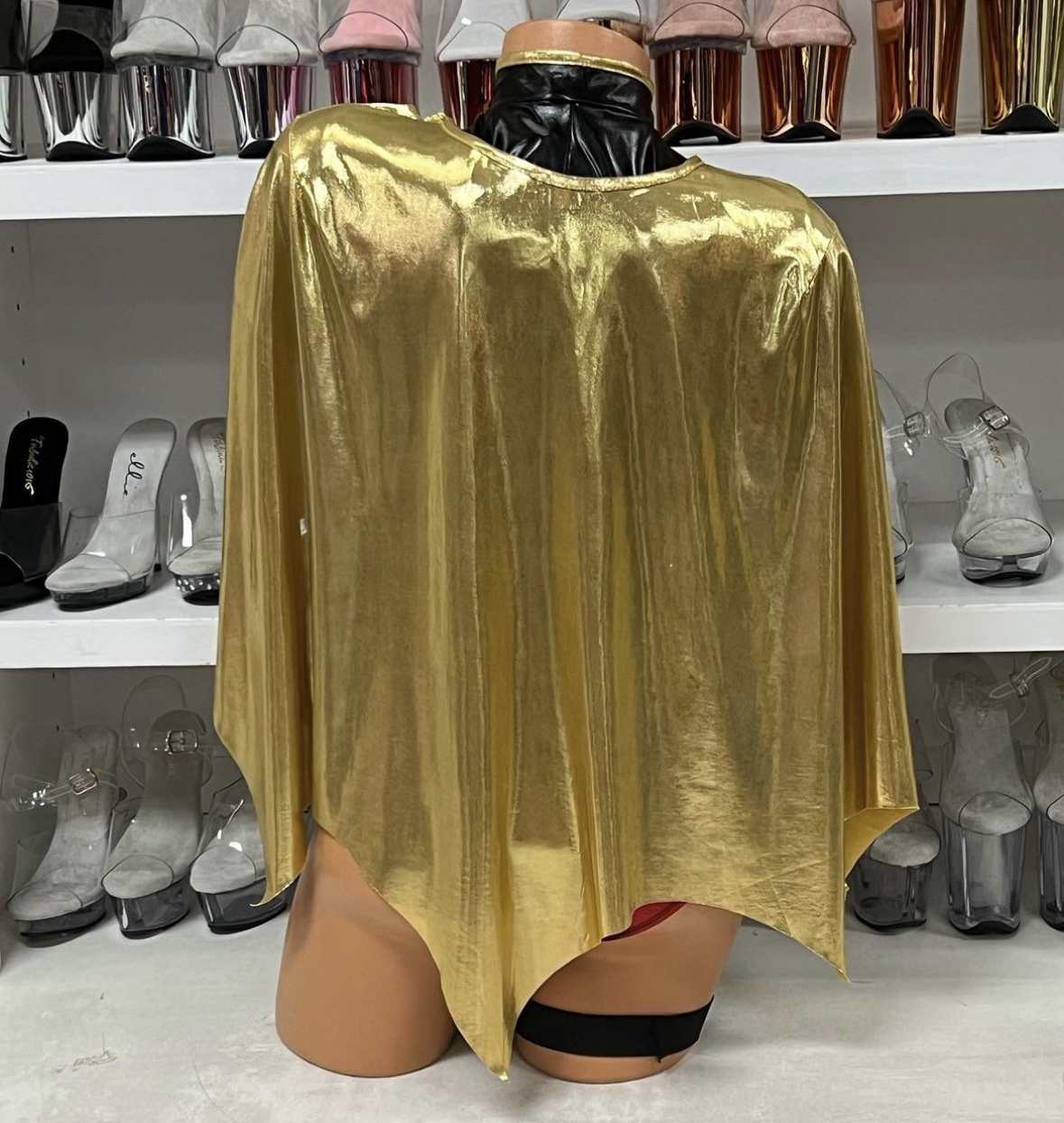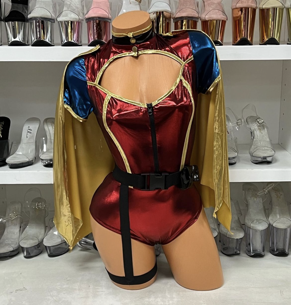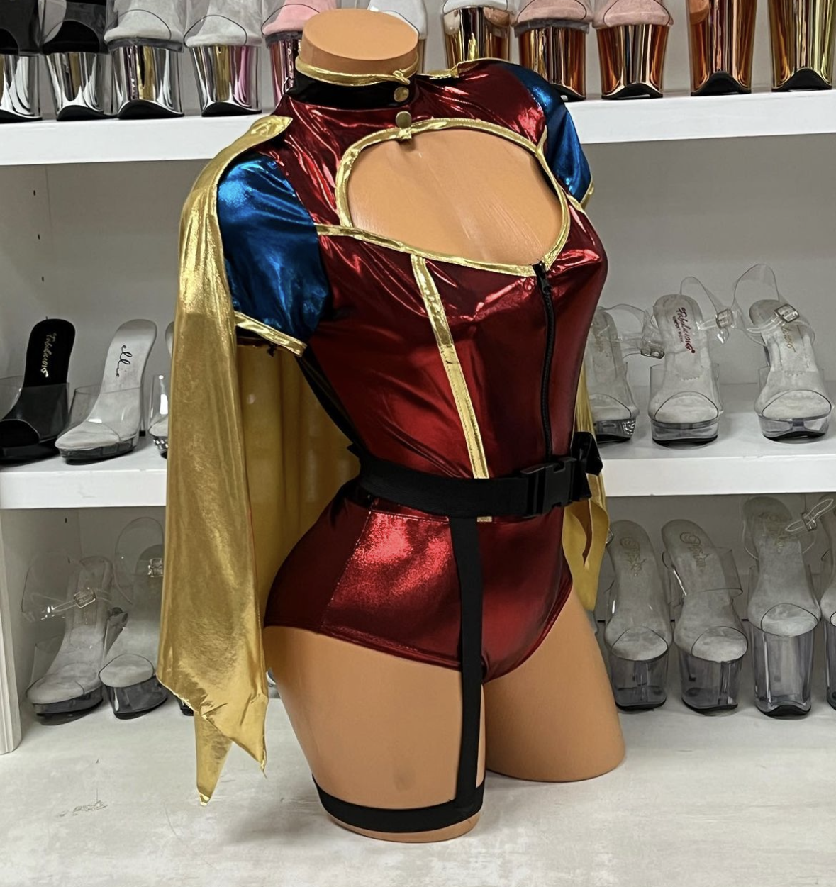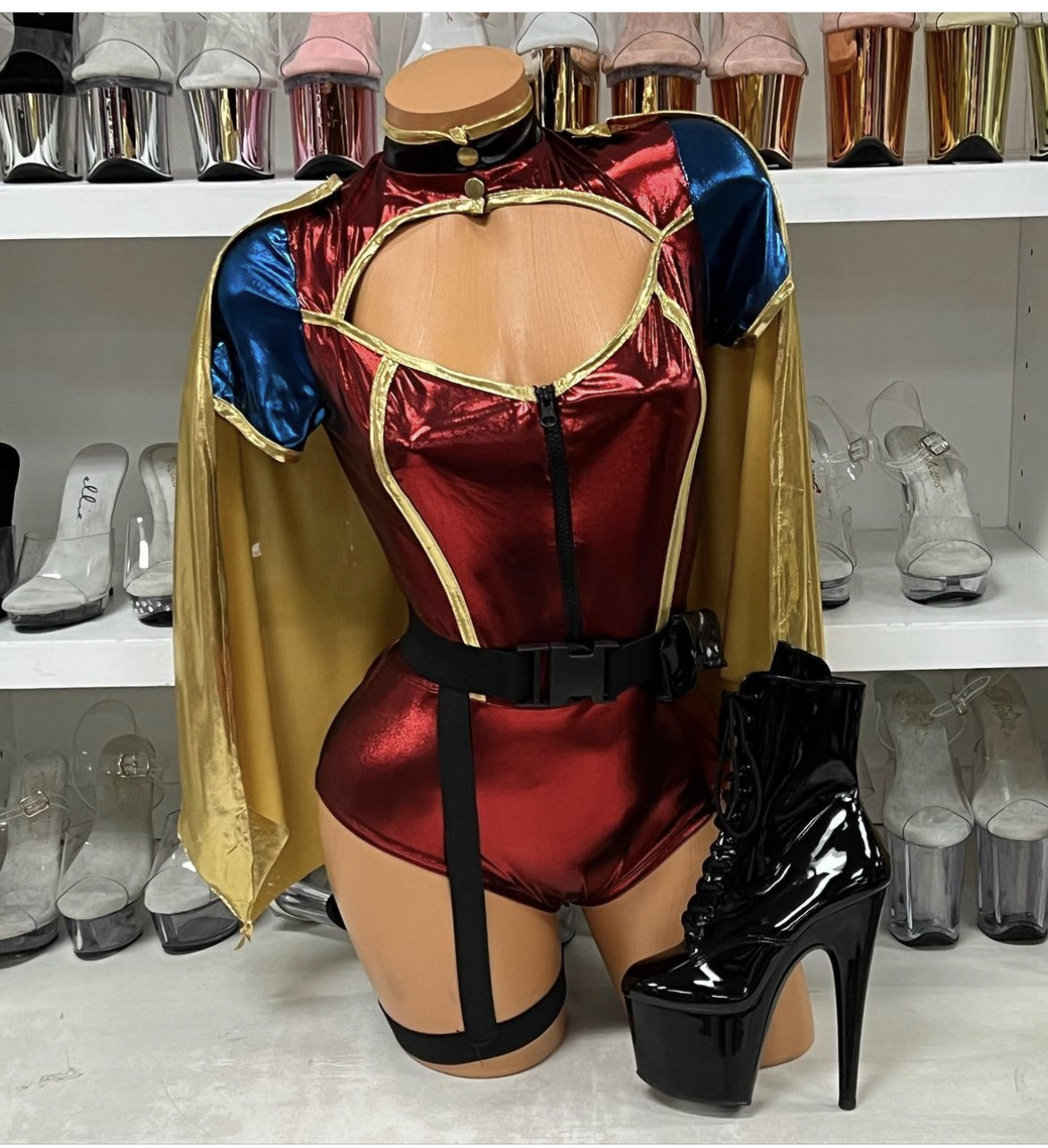 5 PC Sultry Sidekick, includes shimmer zip up bodysuit, detachable cape, belt with attached garter, gloves, and face mask. No returns or exchanges.