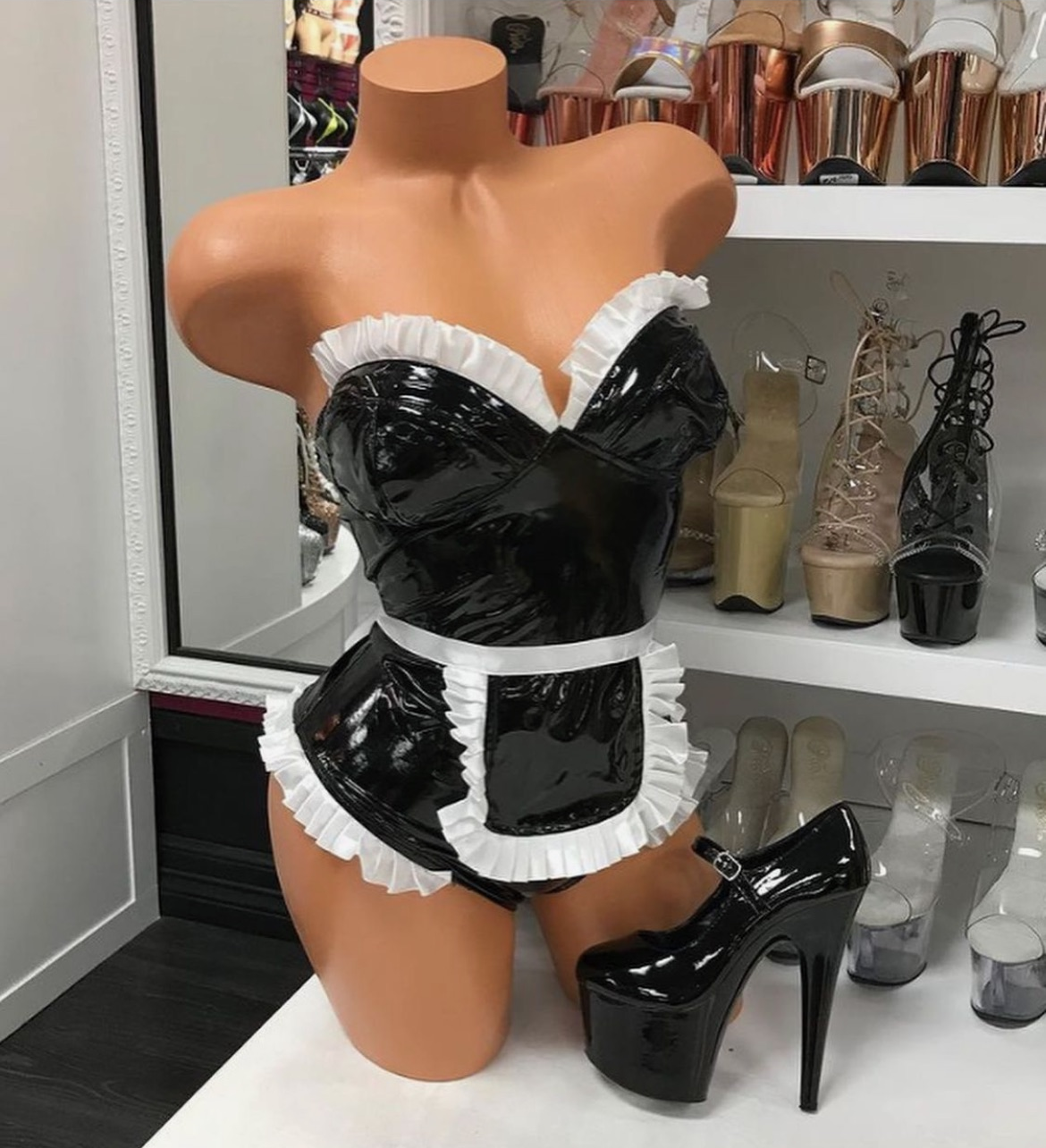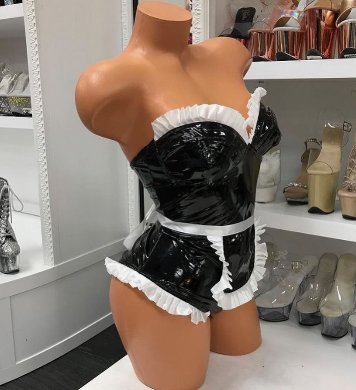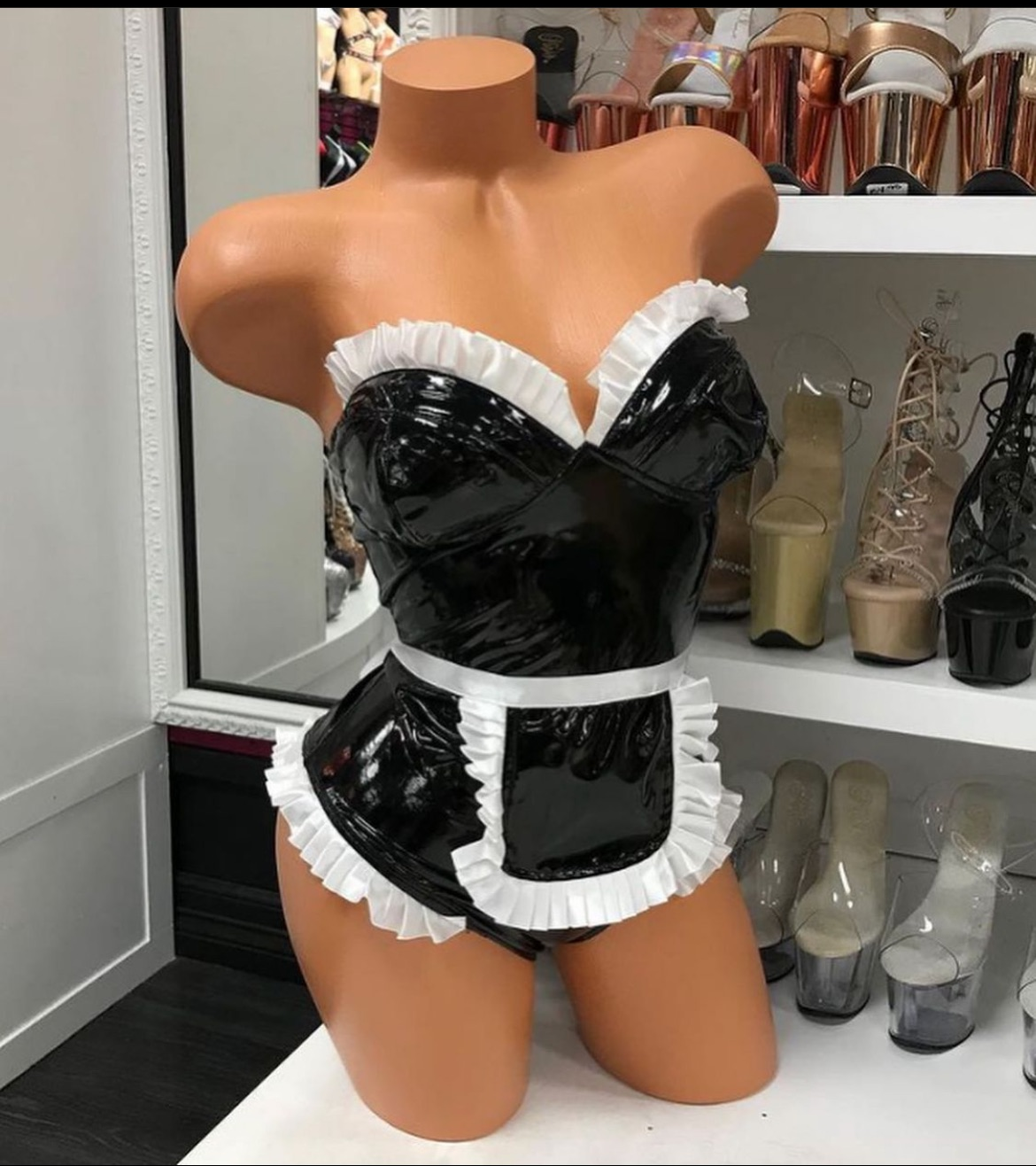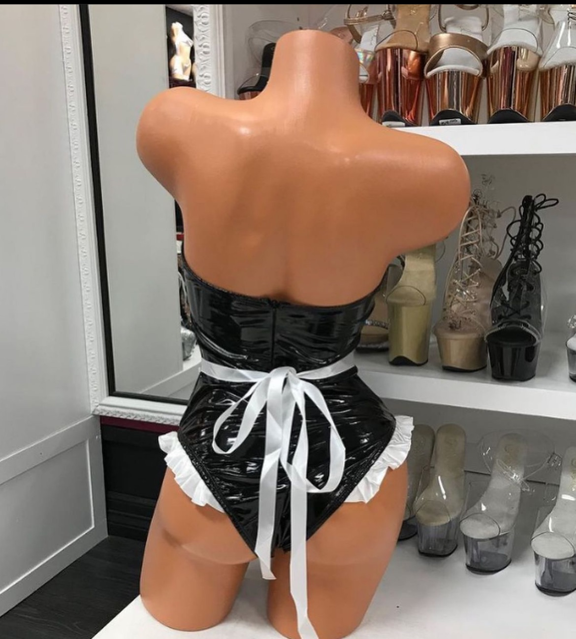 Includes Vinyl Bodysuit, Apron, Headband, and Duster. No returns or exchanges.