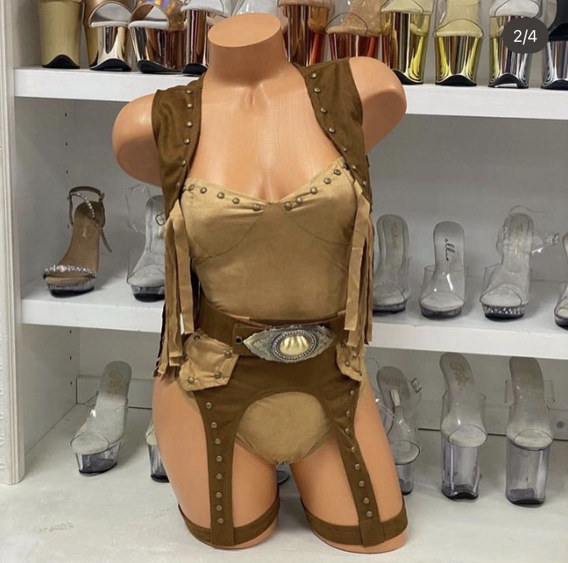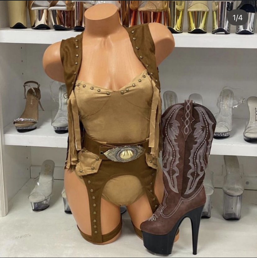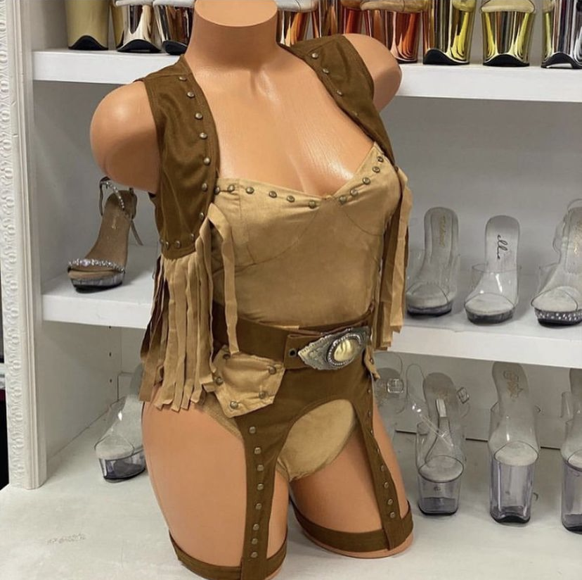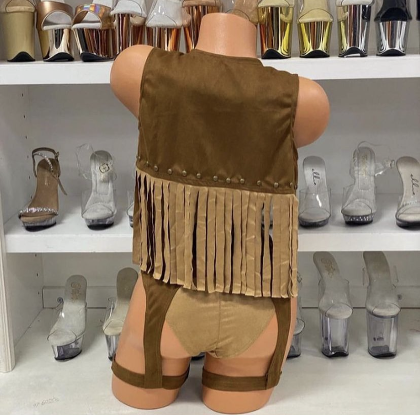 Wild West Babe costume with fringe vest, suede bodysuit, and silver belt