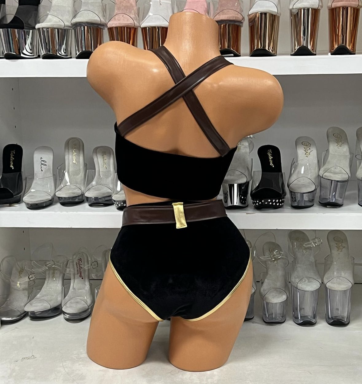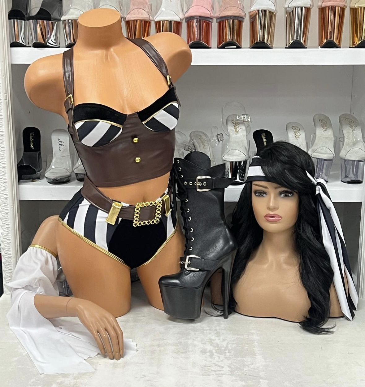 Sexy Pirate costume includes velvet and stripe contrast bustier top, matching high-waisted panty with belt, sleeves and scarf. No returns or exchanges.