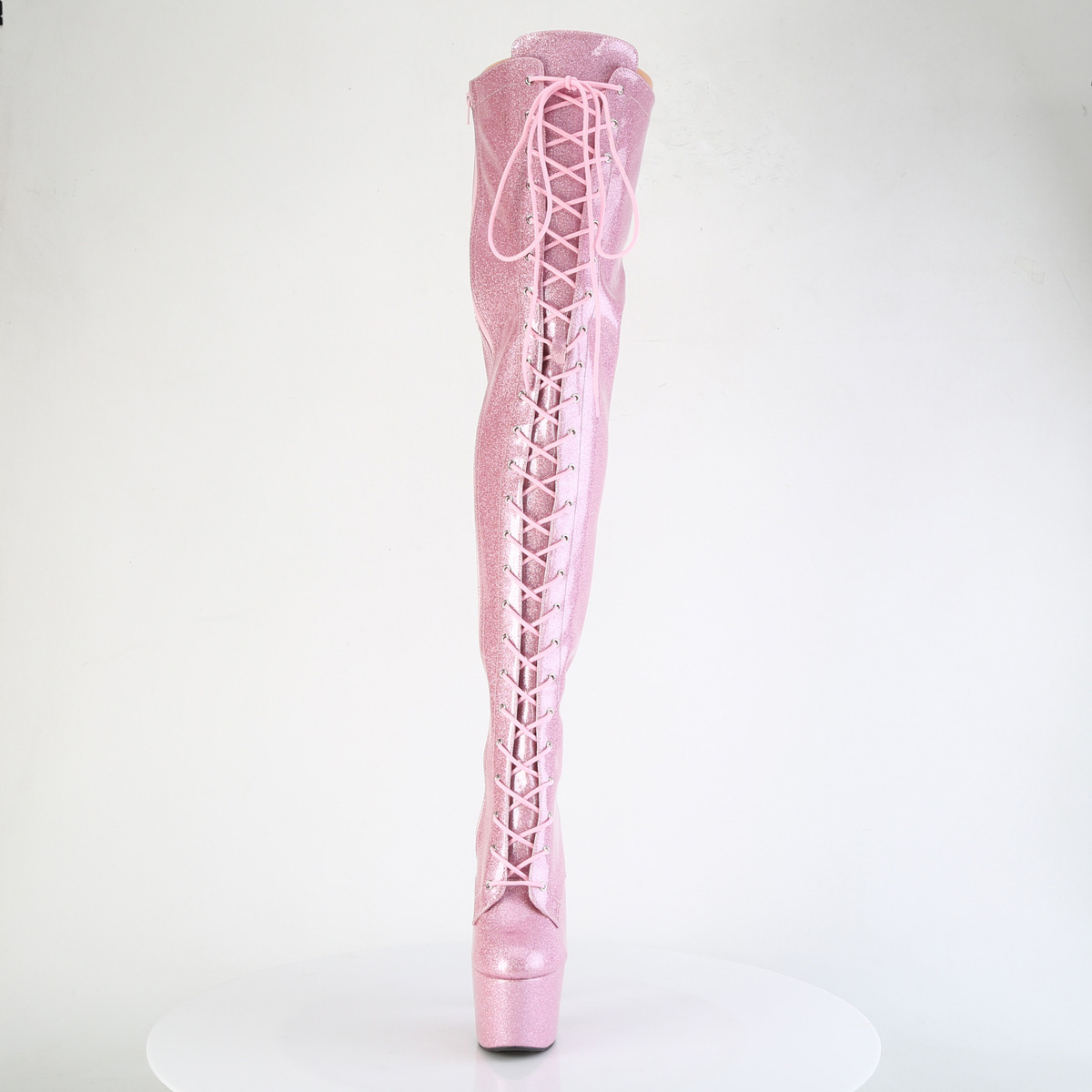 7" Heel, 2 3/4" PF Lace-Up Stretch Thigh Boot, Side Zip