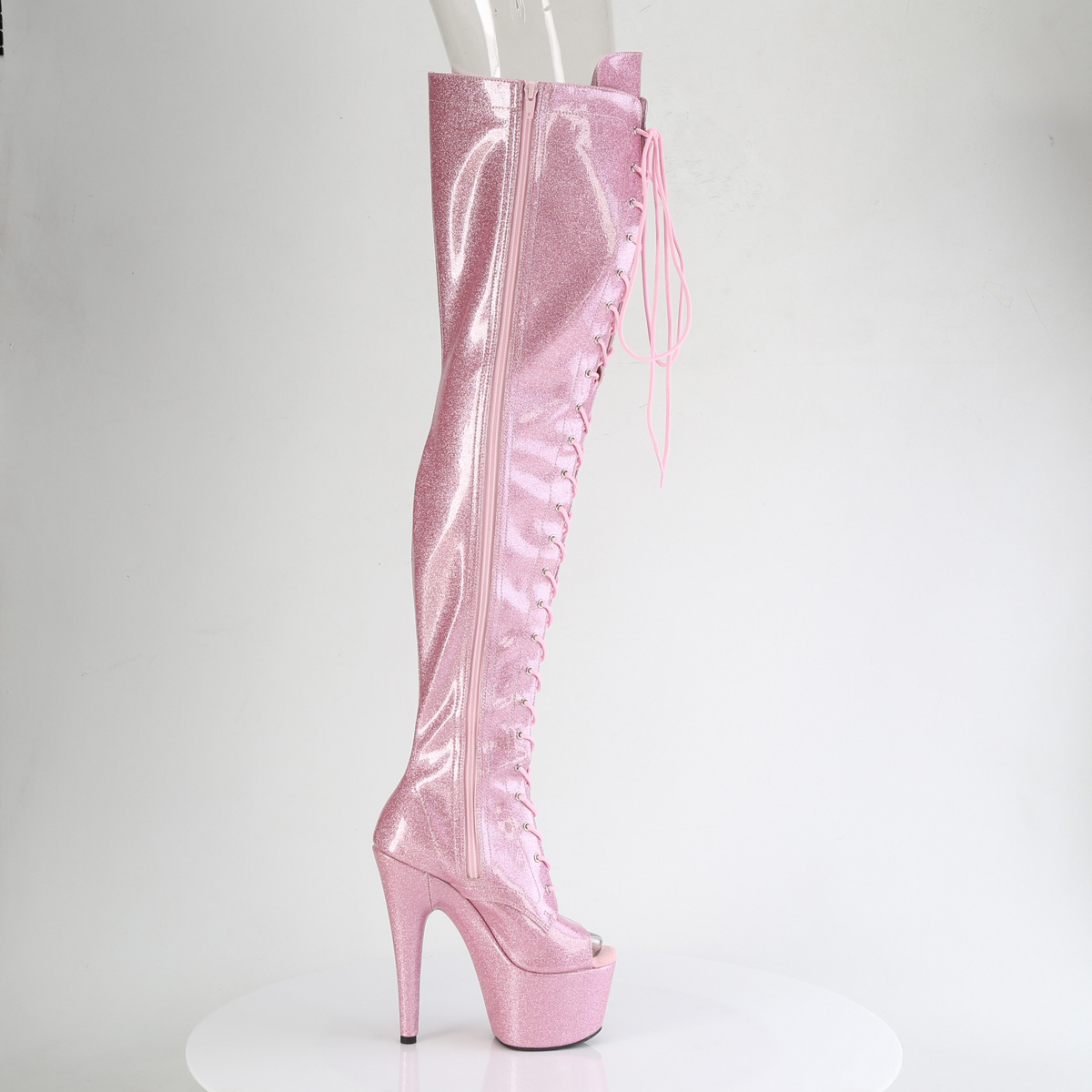 7" Heel, 2 3/4" PF Peep Toe Lace-Up Thigh Boot, Side Zip