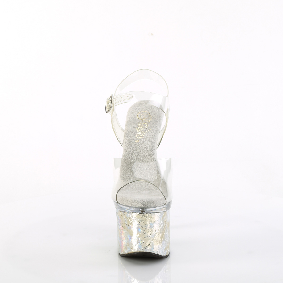 7″” (178mm) Heel, 3″” (76mm) Platform Ankle Strap Sandal Featuring Crackle Hologram Wrapped Lower Platform