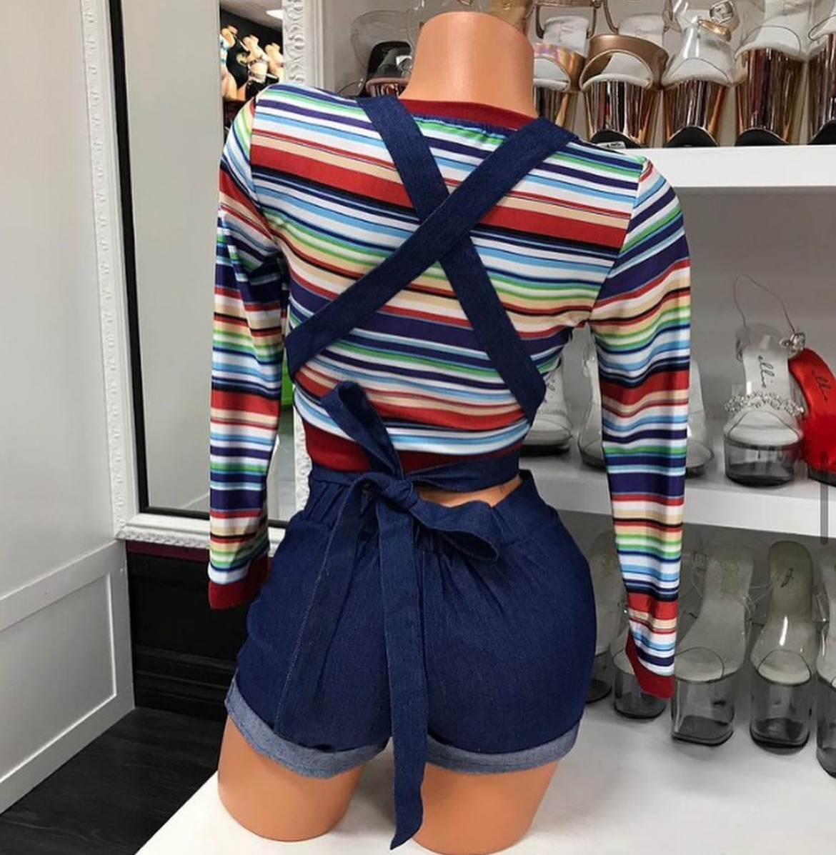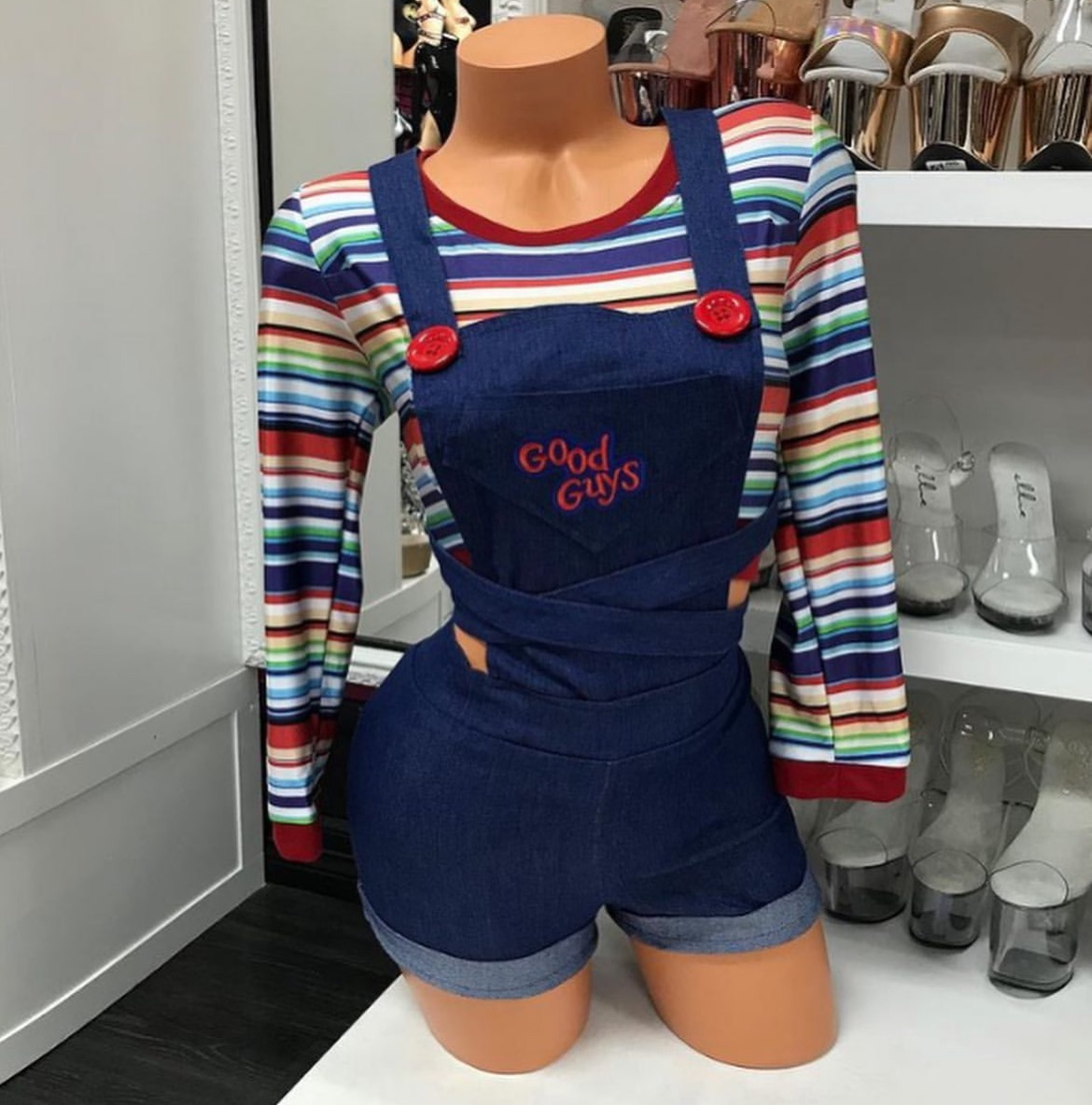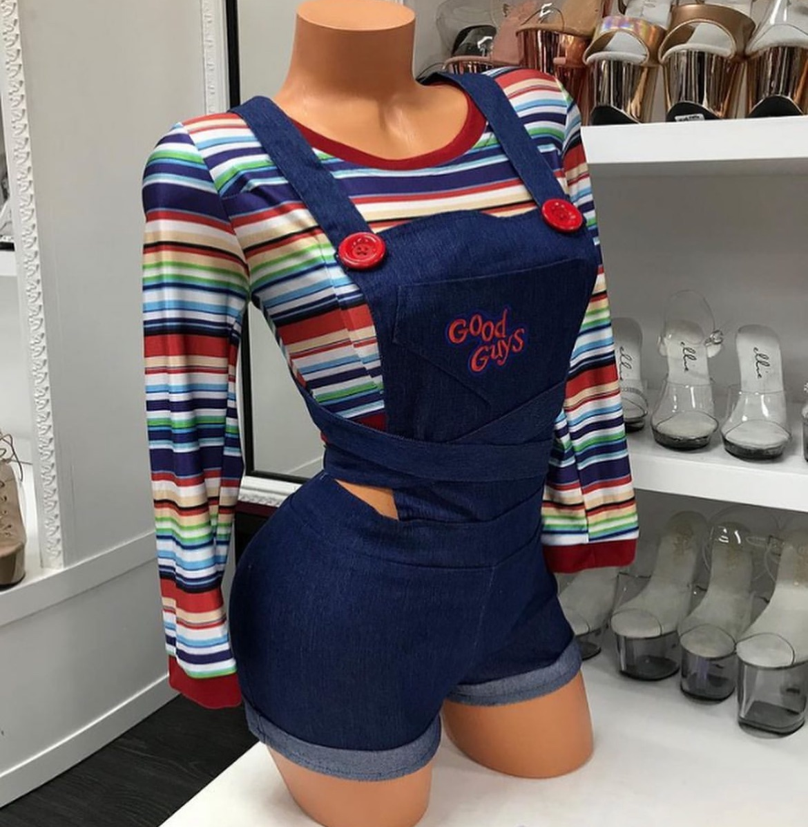 Invoke terror in this Nightmare Killer Doll costume featuring blue overalls with criss-cross straps, red button accents, a “good Guys” applique, a strappy bodice with a tie back closure, a cheeky cut back, a striped, multi-colored crop top with 3/4 length sleeves, and red hair bows. No returns or exchanges.