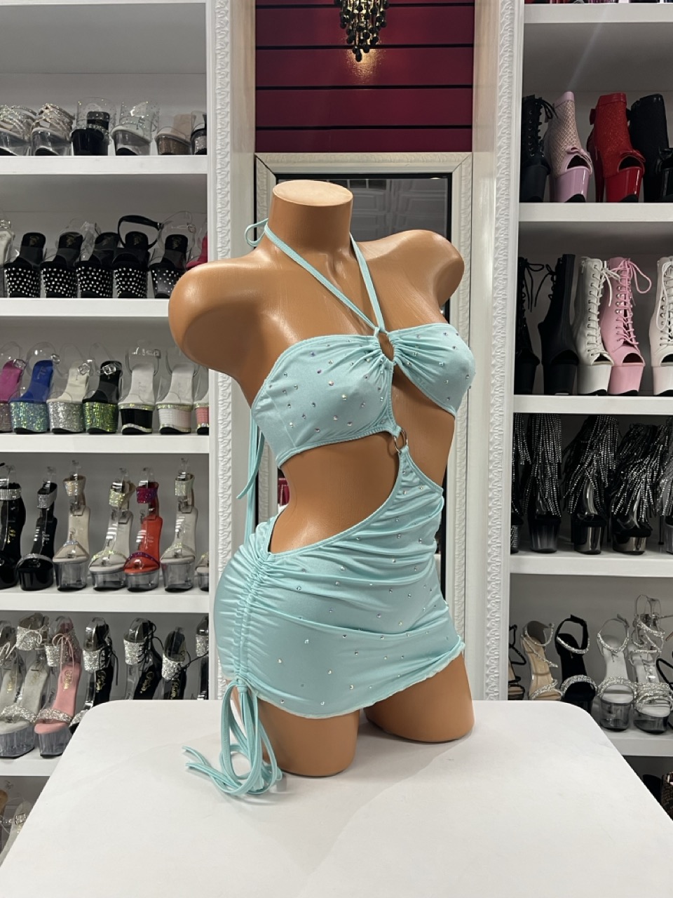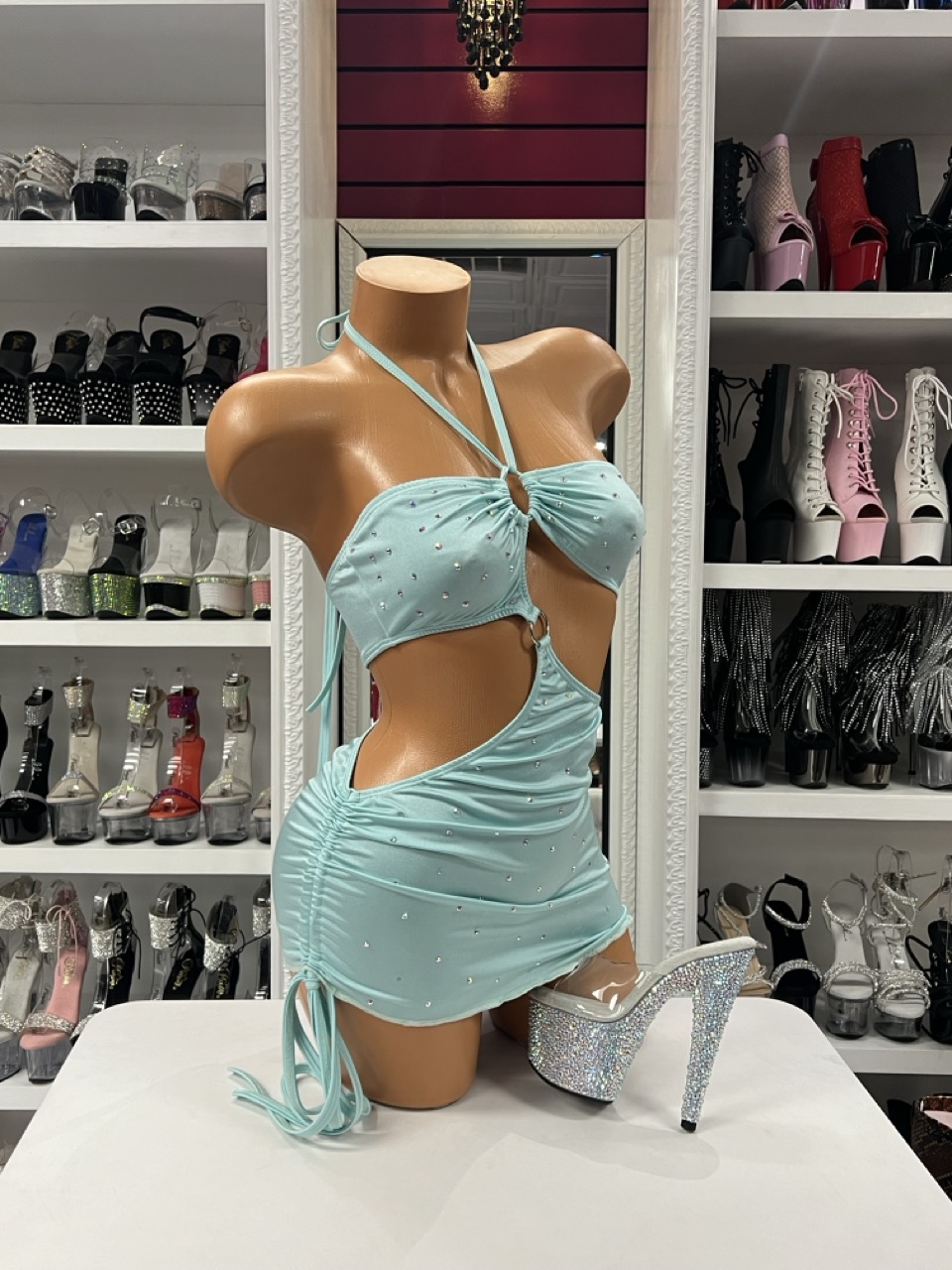 Aqua halter mini dress featuring bold cutouts, crystal accents, and a ruched skirt with adjustable side ties.