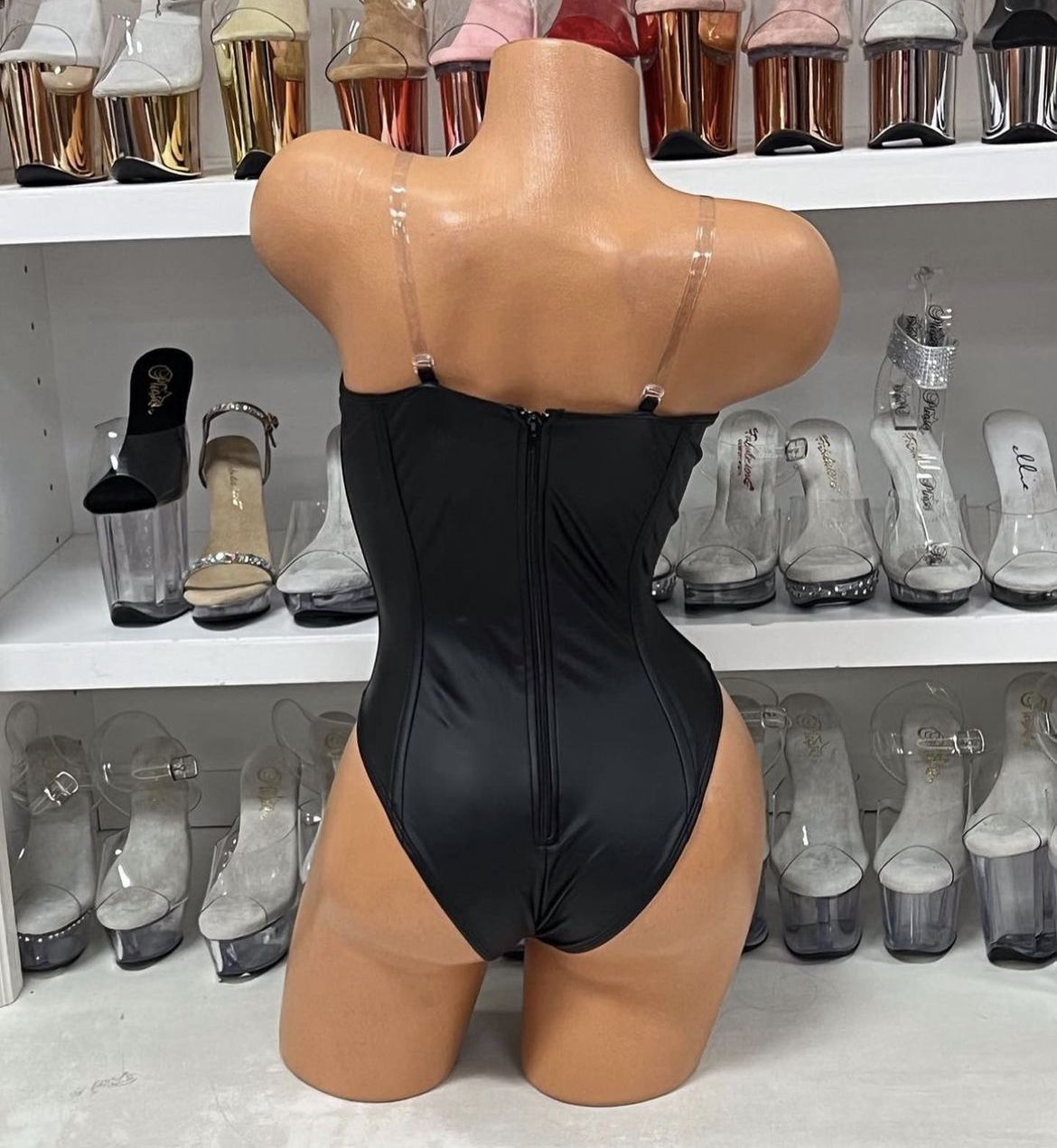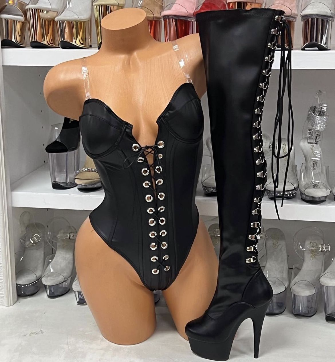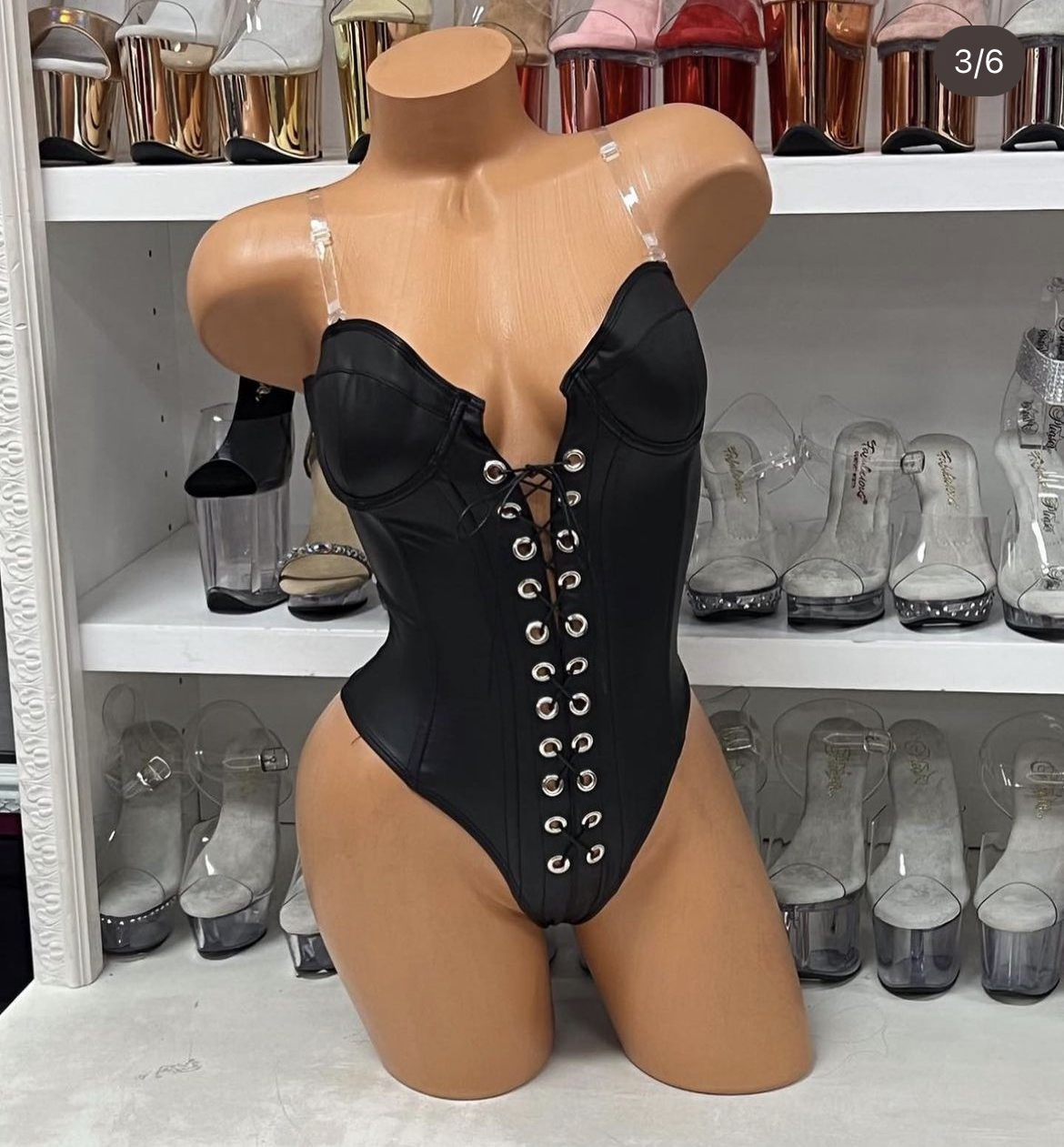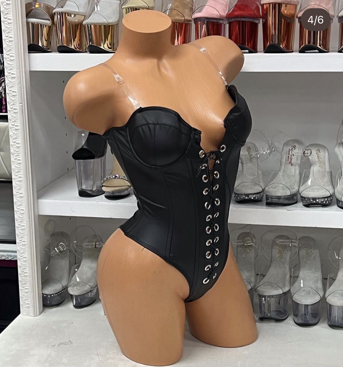 3-piece sexy movie character costume features faux leather lace-up grommet bodysuit with detachable invisible straps and matching fingerless gloves and synthetic front bang costume wig. No returns or exchanges.
