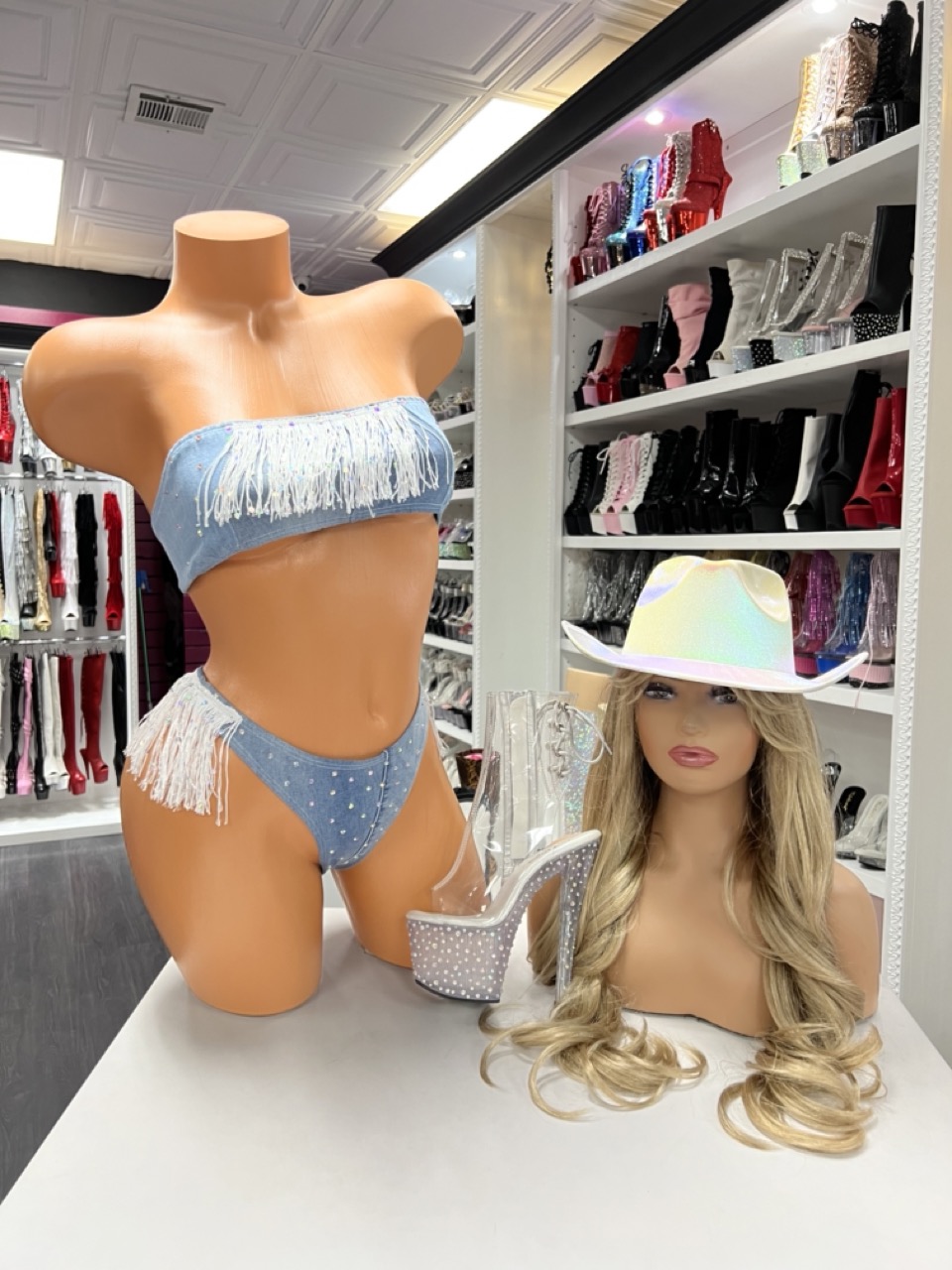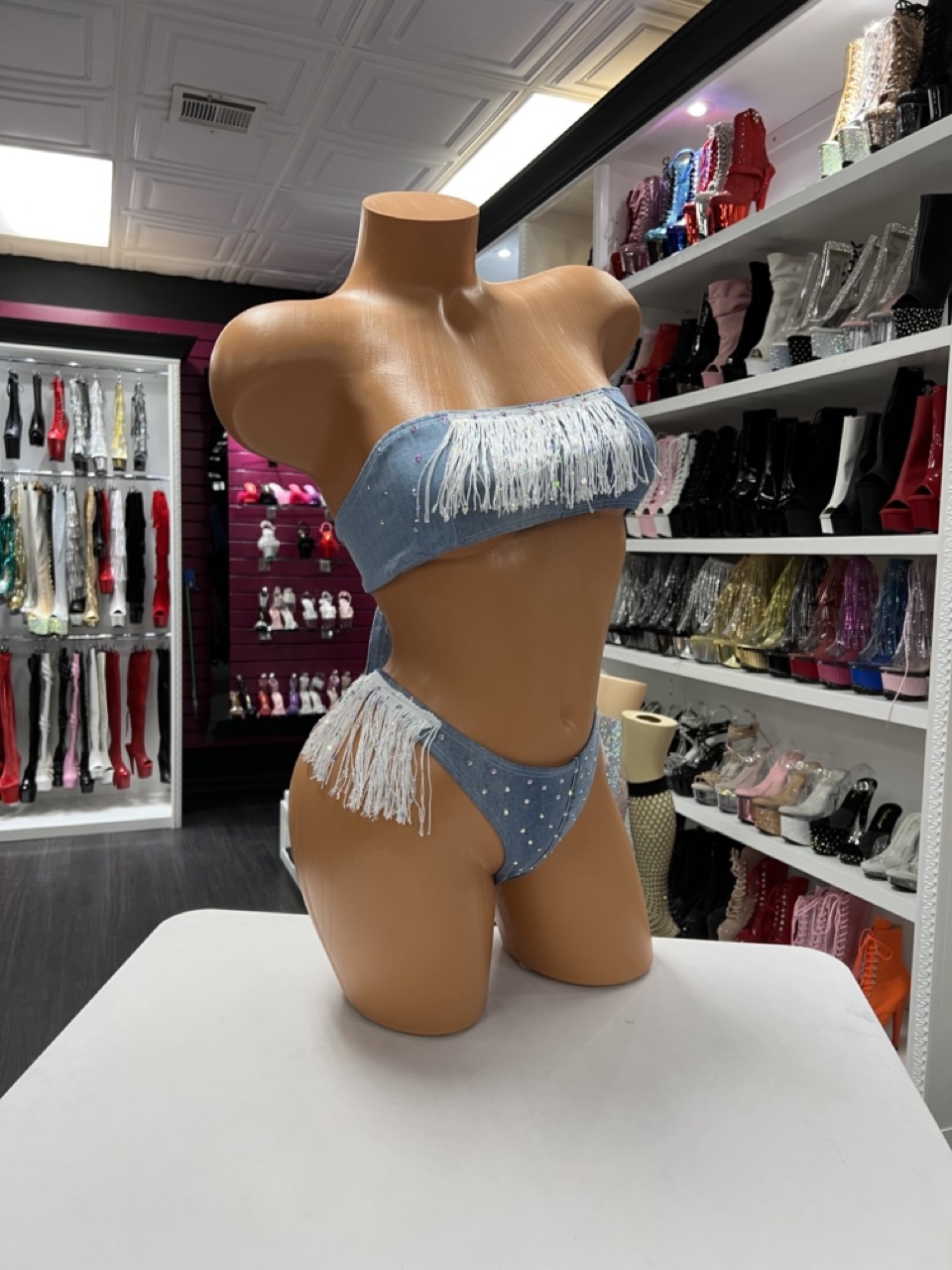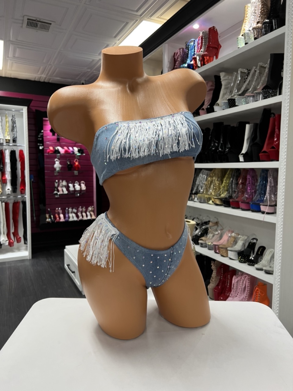 Baby blue fringe bandeau bikini with rhinestones and dramatic movement. Perfect for rodeo nights, festivals, and stage glam.