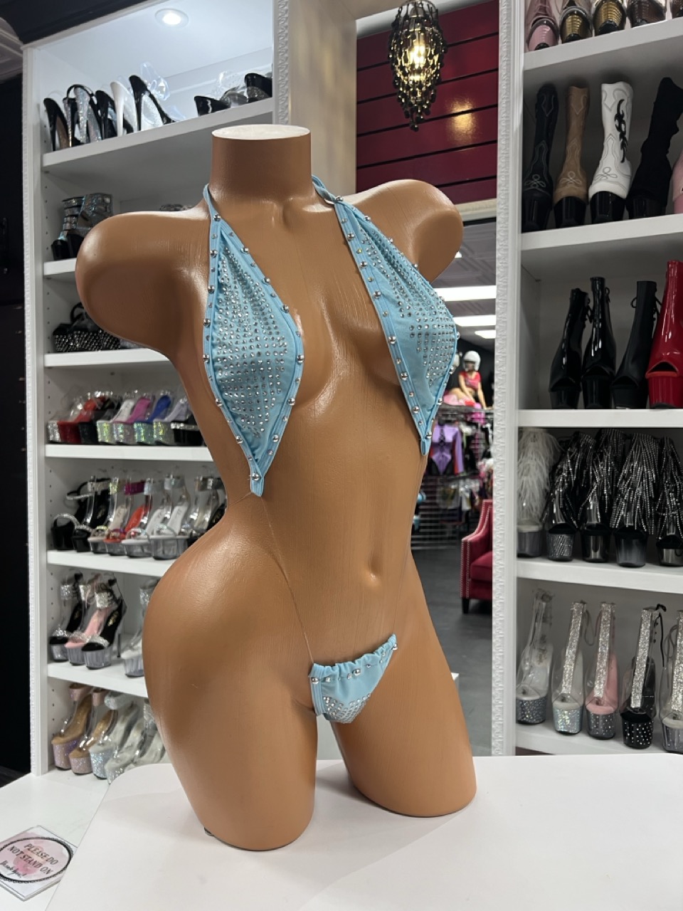 baby blue rhinestone slingshot with rhinestone top and g-string bottom on mannequin