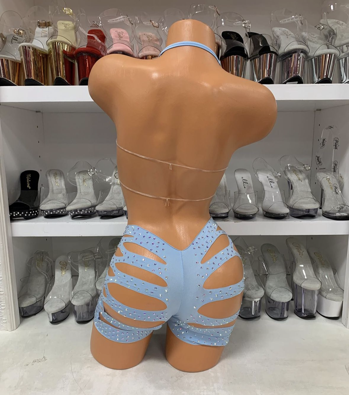 This dazzling two-piece set includes a cut-out star top with adjustable straps and matching shorts with dramatic side cut-outs connected by strappy details. Each piece features intricate rhinestone star patterns that catch the light beautifully. The premium stretch fabric ensures comfort while the bold design guarantees you’ll make an unforgettable impression. One size fits most. No returns/exchanges.