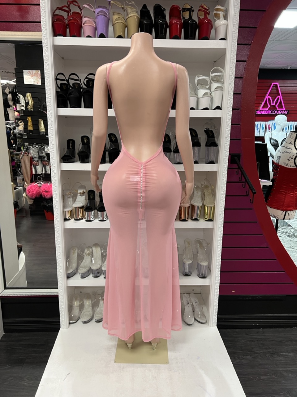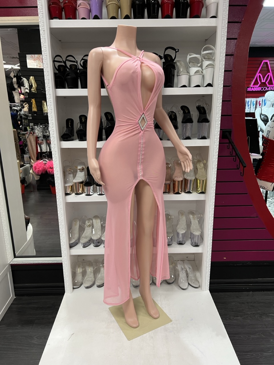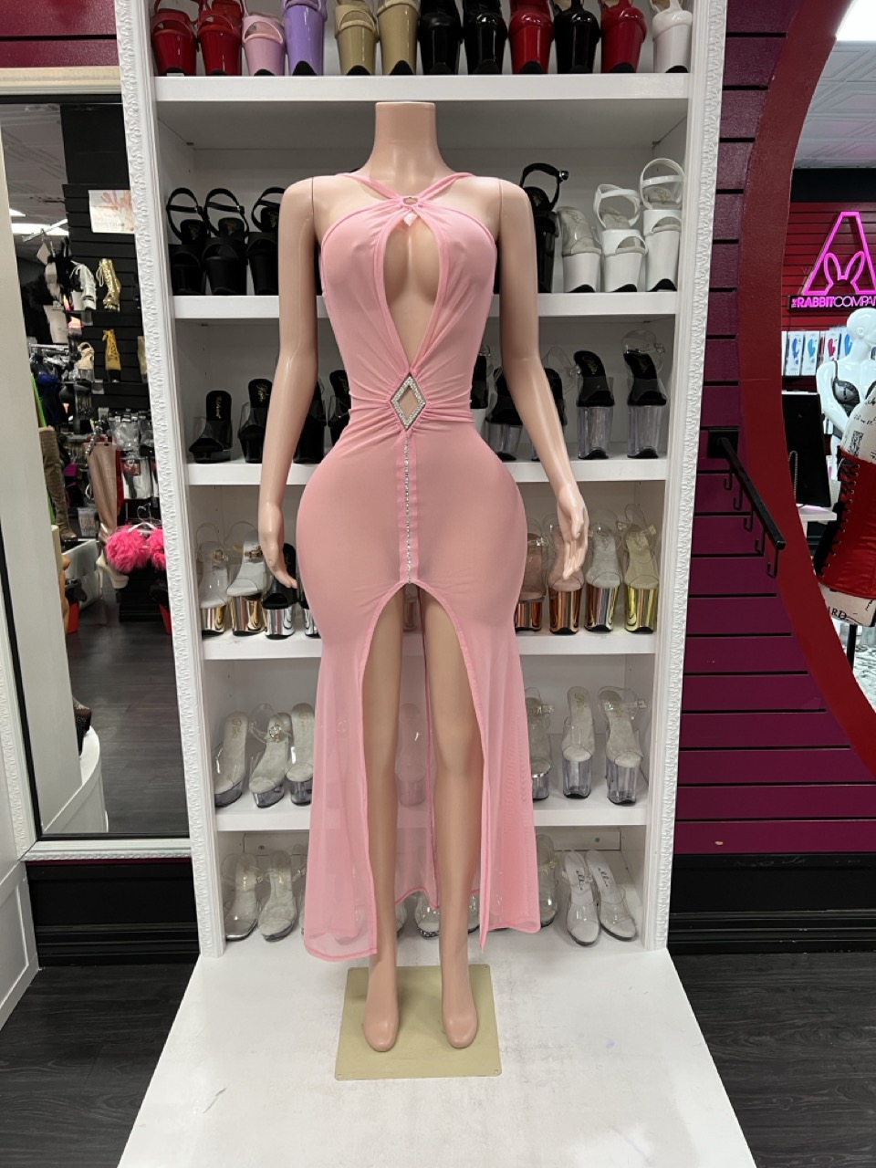 Sheer baby pink halter dress with sparkling diamond-style waist detail and bold front slit. Lightweight, stretchy, and made for confident stage movement.