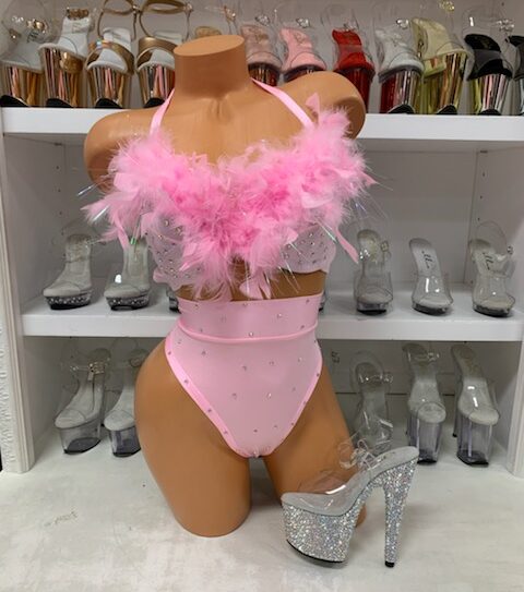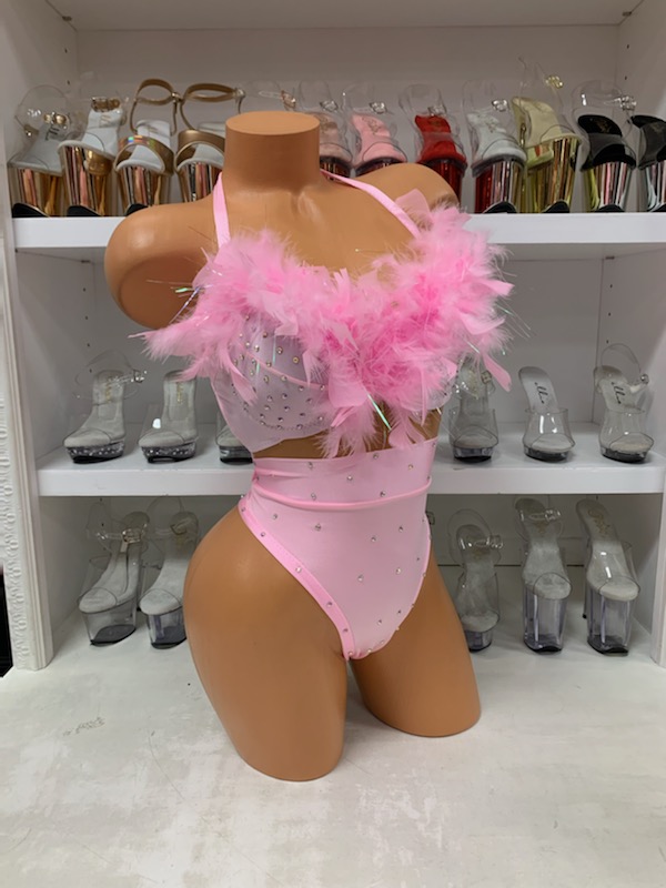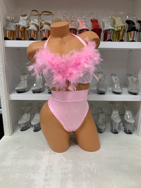 Baby Pink Feather Bra with High Waist Bottoms