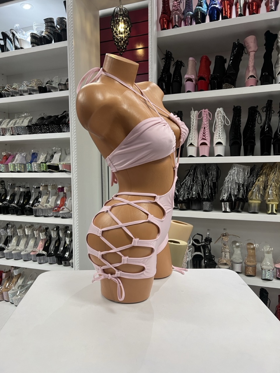 Soft and seductive baby pink lace romper featuring adjustable side lace detailing, halter neckline, and a curve-enhancing stretch fit for a bold feminine look.