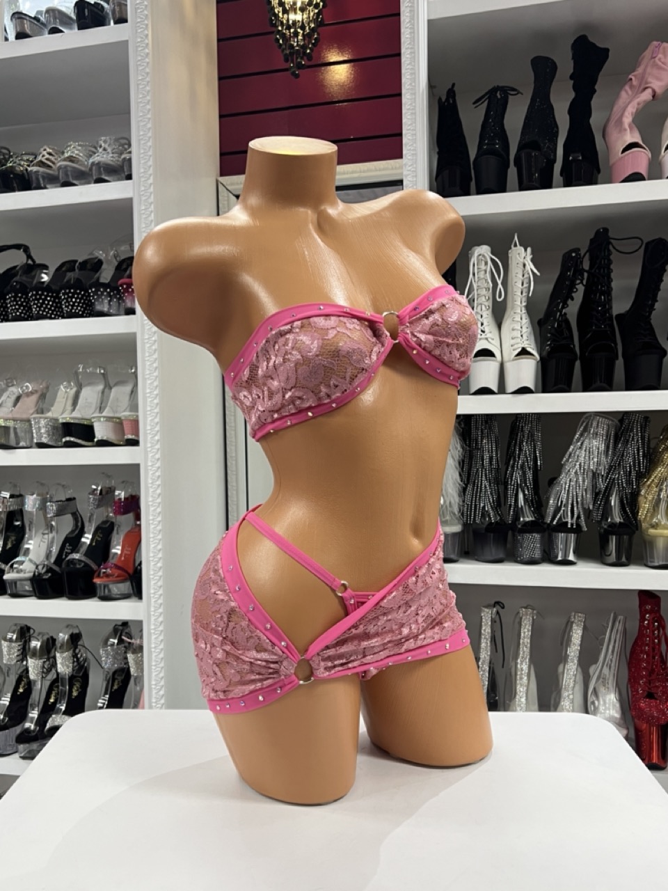 Two-piece baby pink lace set with bandeau top and matching cutout skirt. Soft, stretchy, and stage-ready.