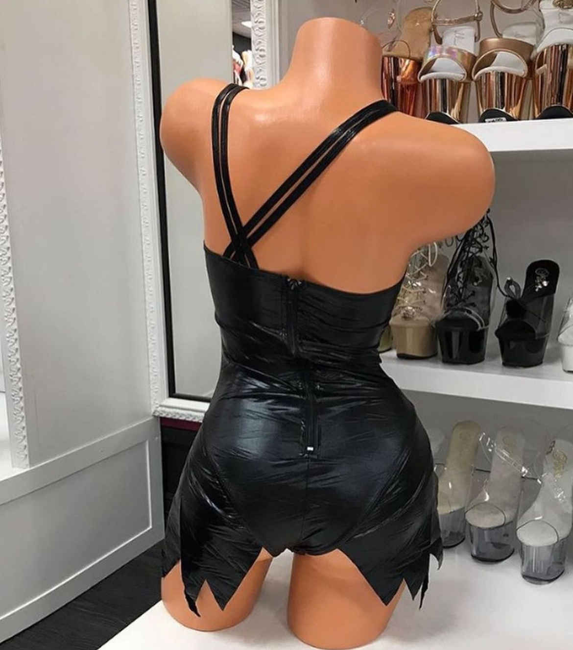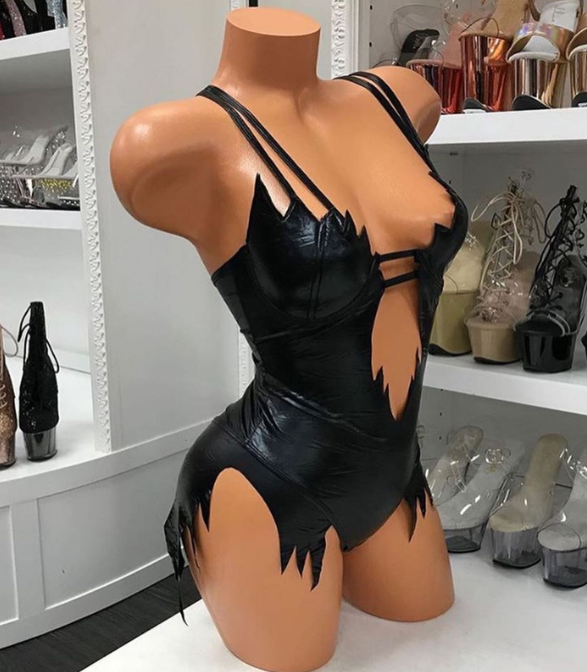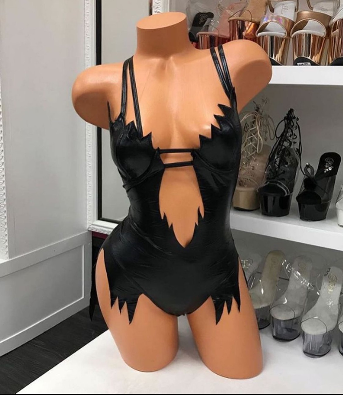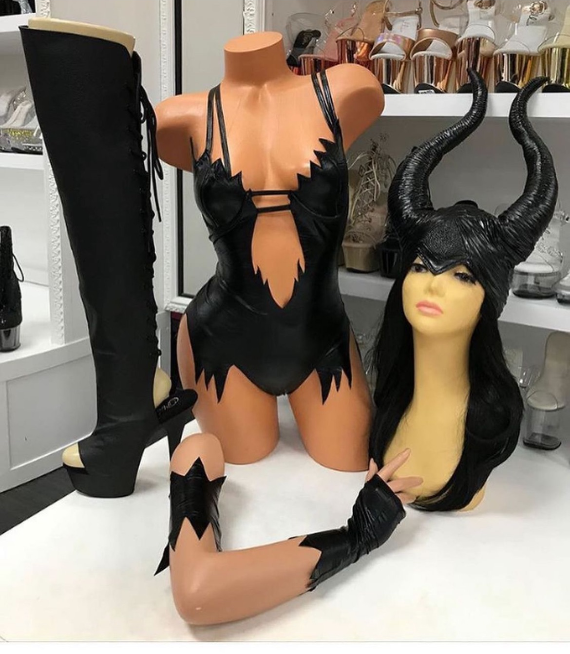 4-piece movie villain character costume features embossed bodysuit with double cross shoulder straps, jagged edge design, midsection cutout, matching single glove, armband and horn headpiece. No returns or exchanges.