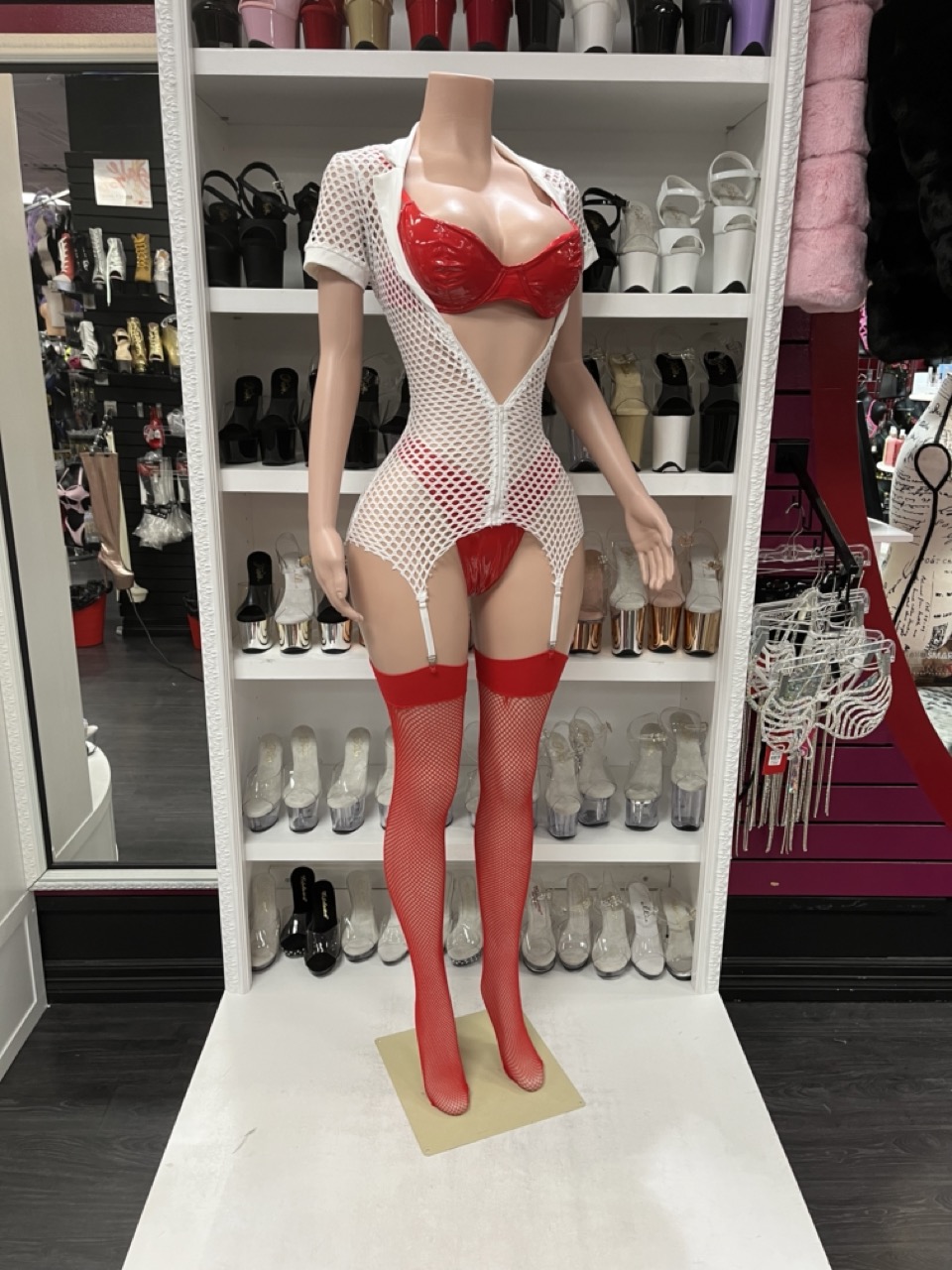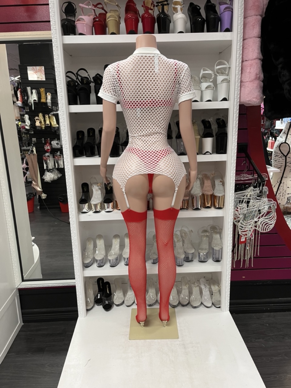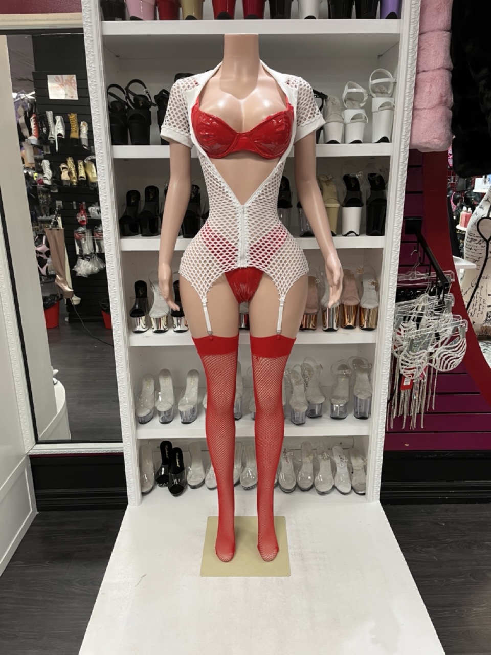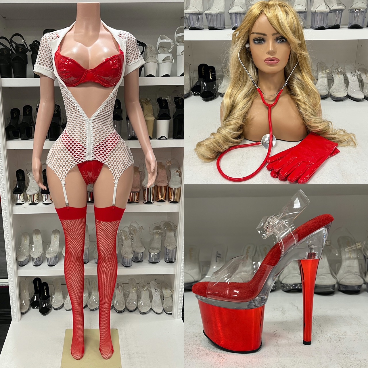 Bedside Manner Costume includes mesh dress, red lingerie set, gloves, stockings, headband, and stethoscope. A bold nurse fantasy look.