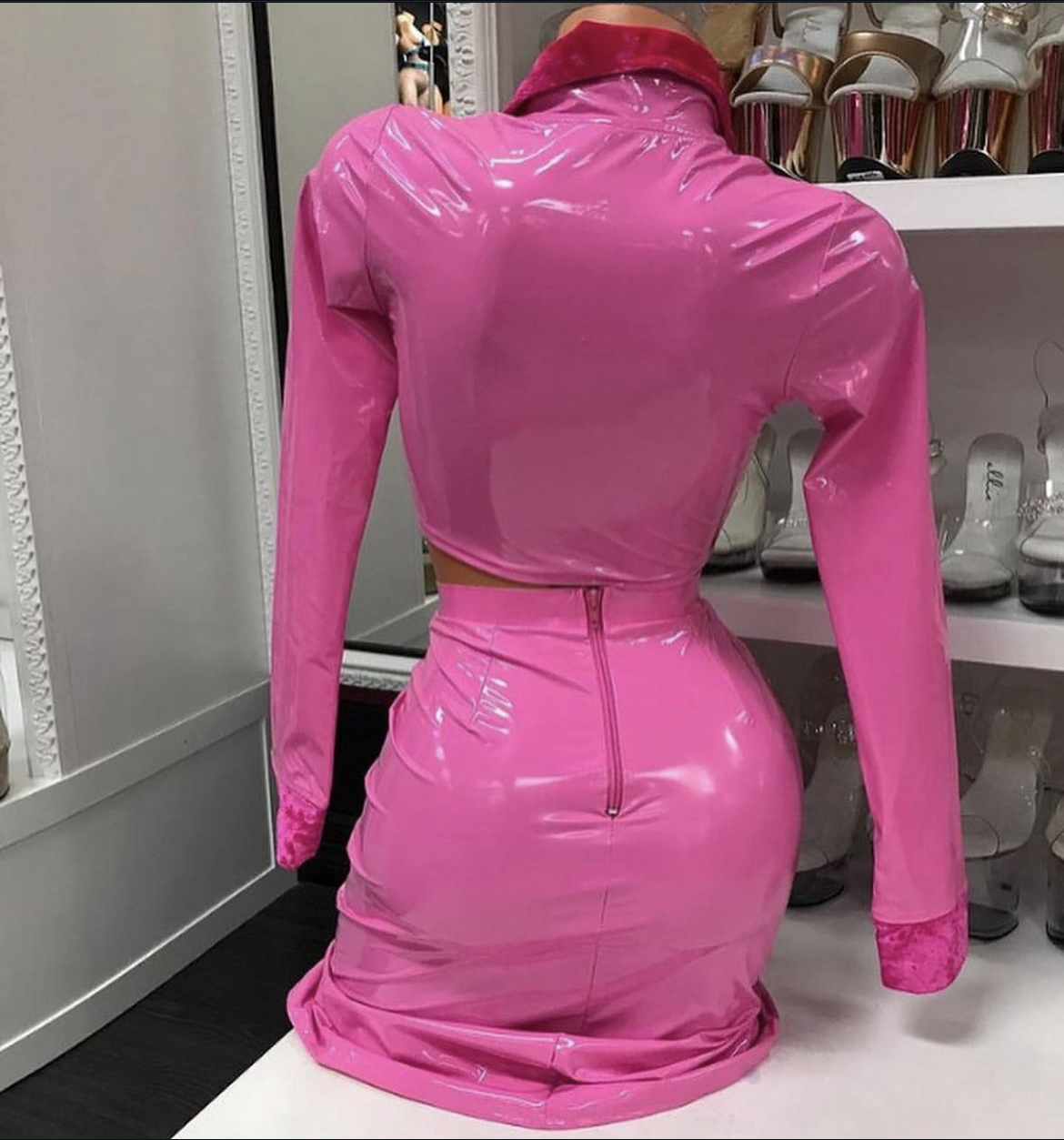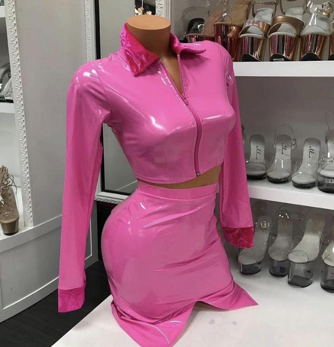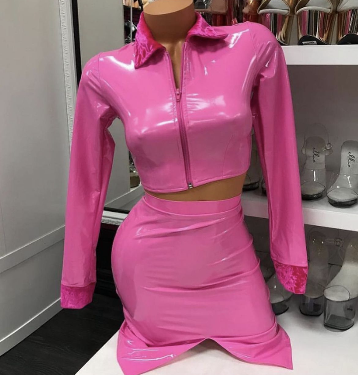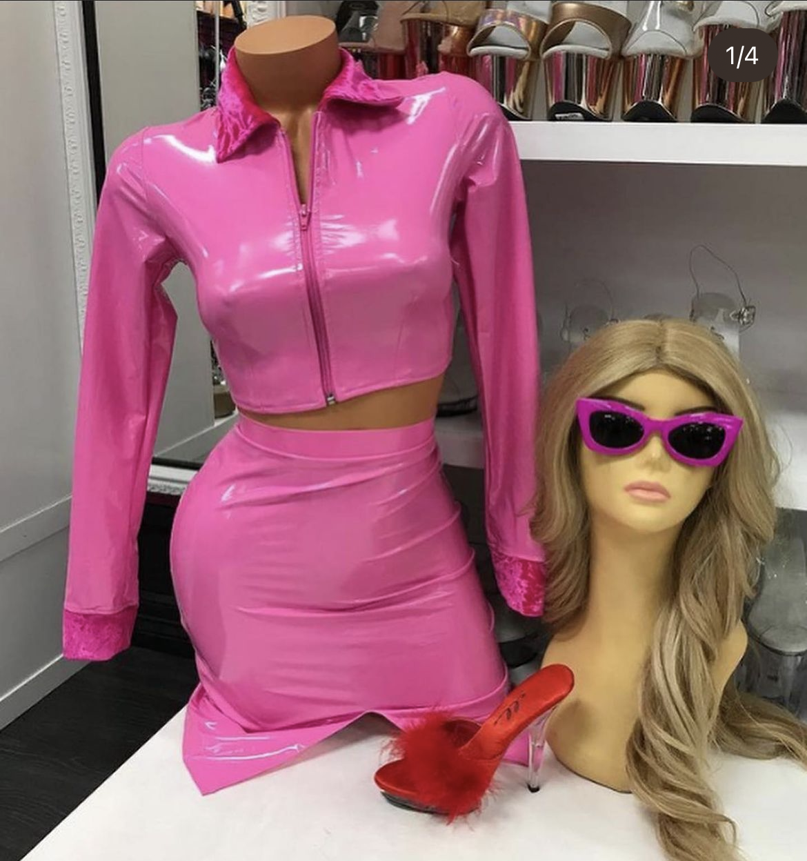 3pc. sexy movie character costume includes vinyl cropped jacket with velvet collar and cuffs, matching high-waisted skirt with front slit and sunglasses. No returns or exchanges.
