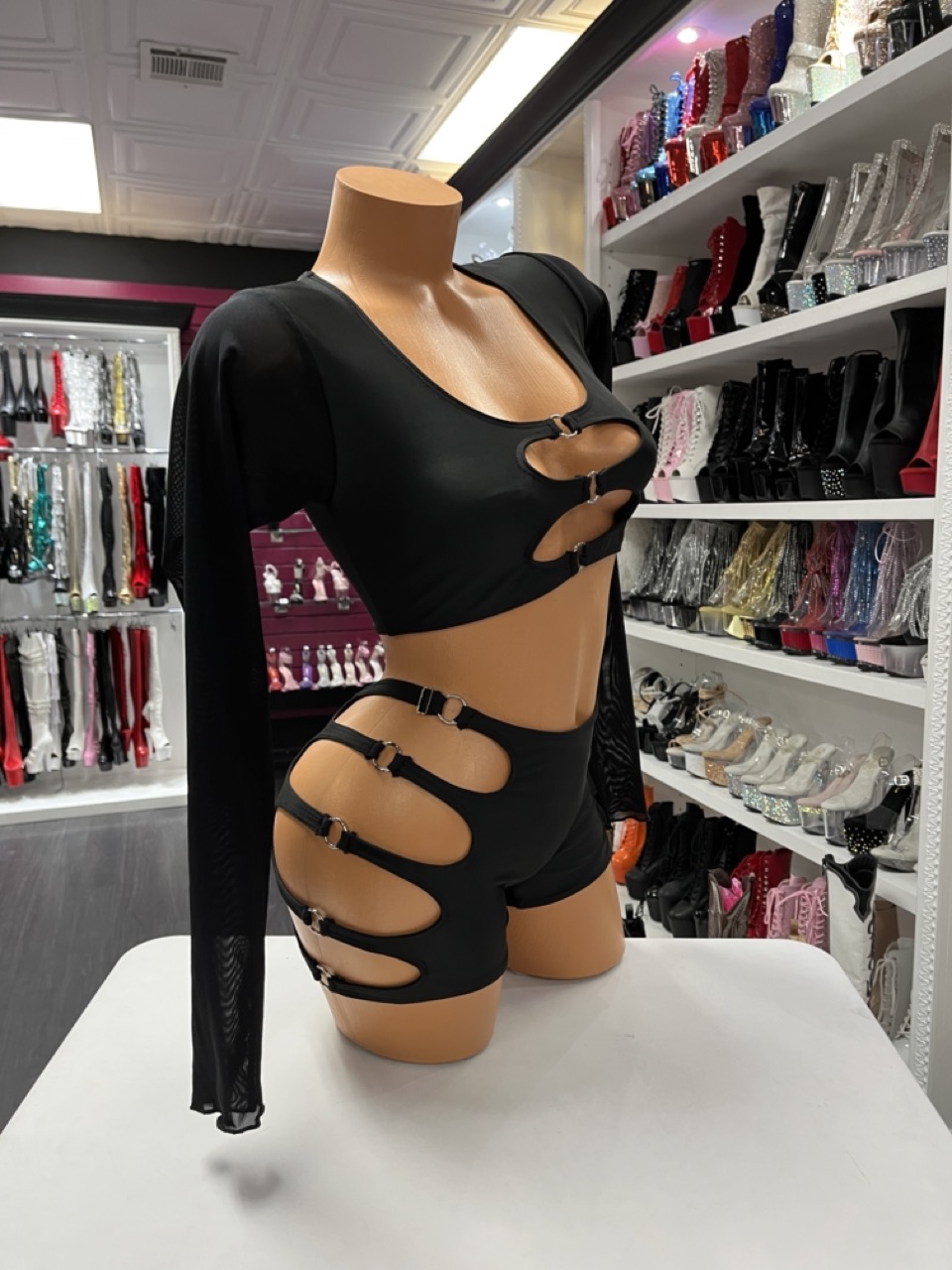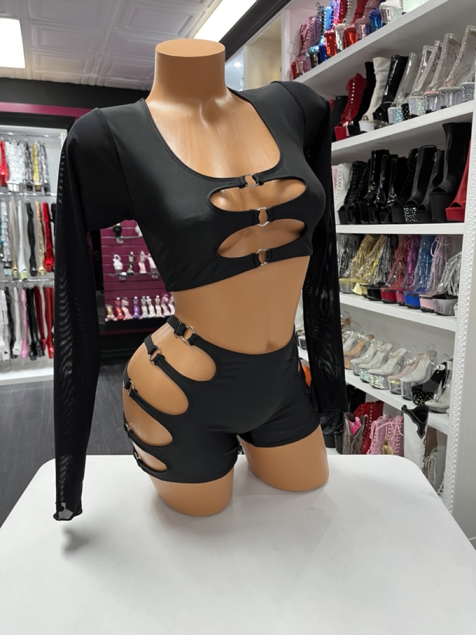 Black two-piece with long sleeve crop top and high-waisted shorts featuring bold buckle cutouts. Sleek, structured, and performance ready.