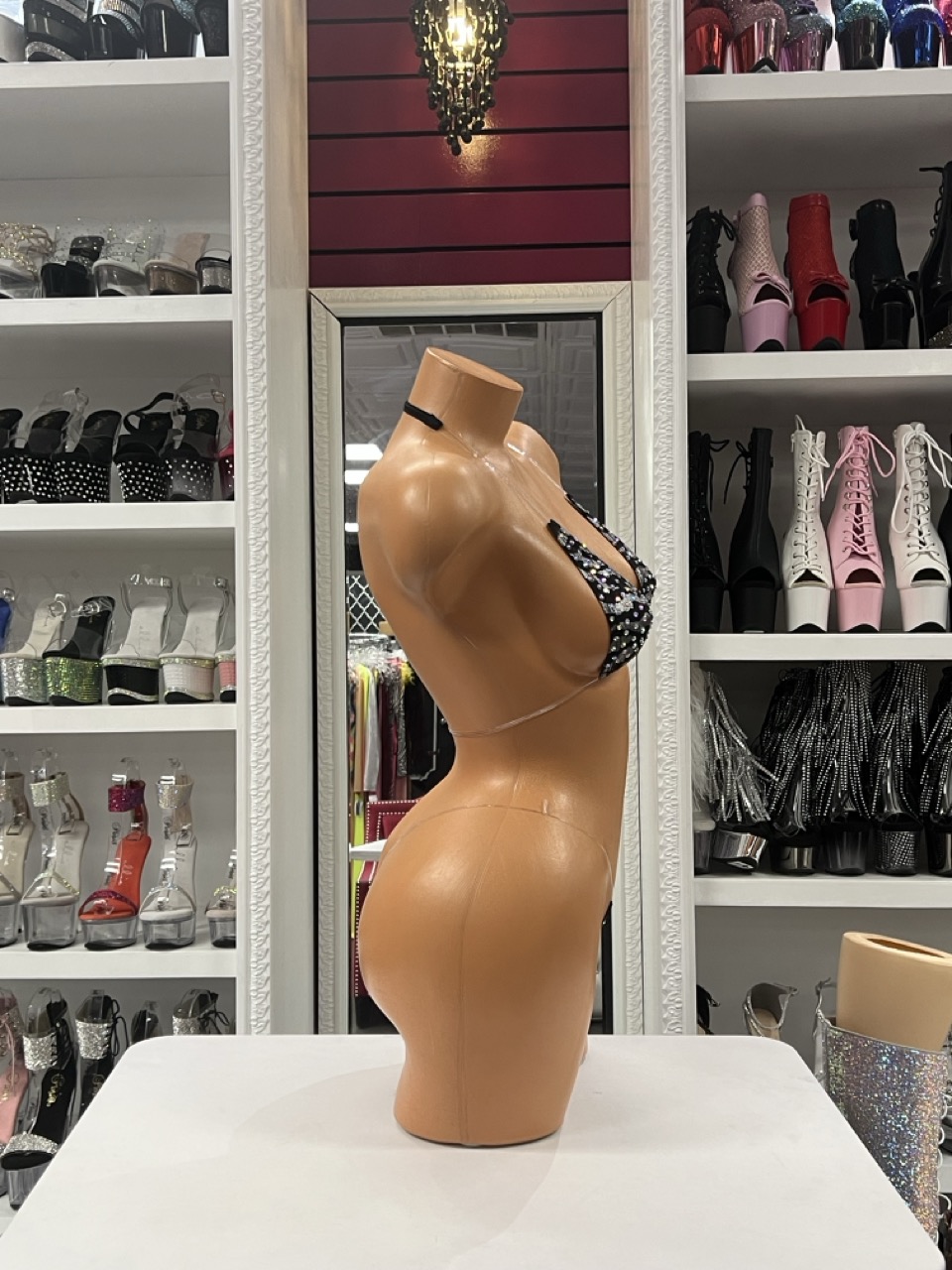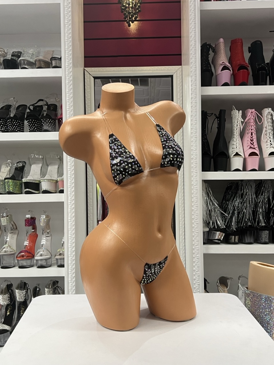 Black crystal micro bikini with sparkling rhinestones and clear straps. A glamorous minimalist stage outfit for performers.