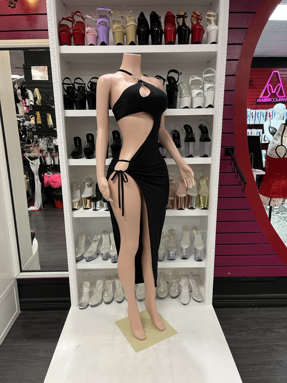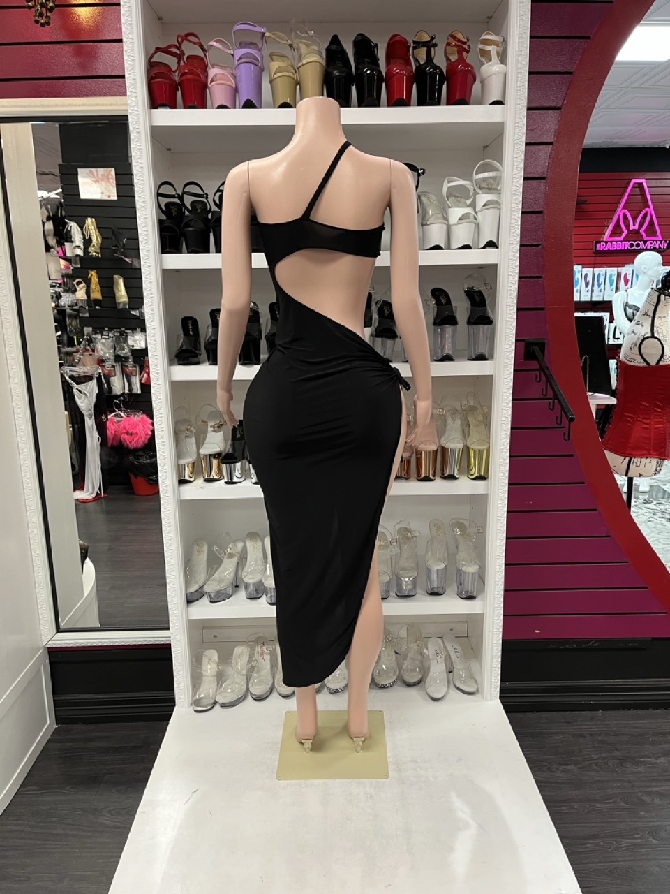 Black one-shoulder dress with bold waist cutout, adjustable hip tie, and high slit. Stretchy, sleek, and made for confident stage movement.