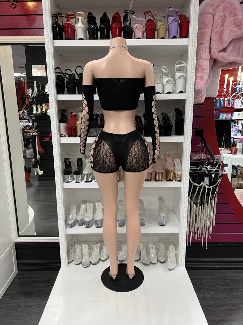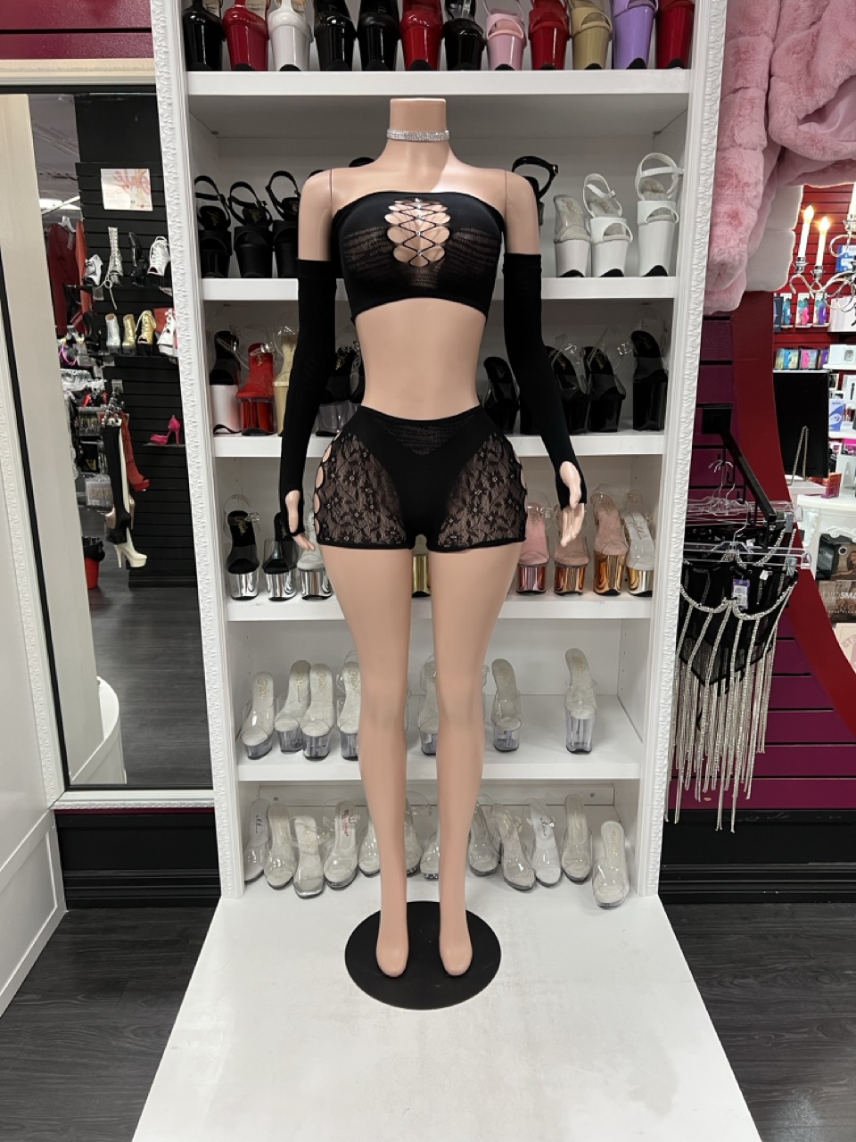 Turn heads in this fierce black 3-piece set featuring a strapless bandeau top with lace-up front, matching high-waisted mesh shorts, and long matching sleeves. The sheer lace paneling and bold cutouts make this outfit perfect for stage, clubwear, or a daring night out.