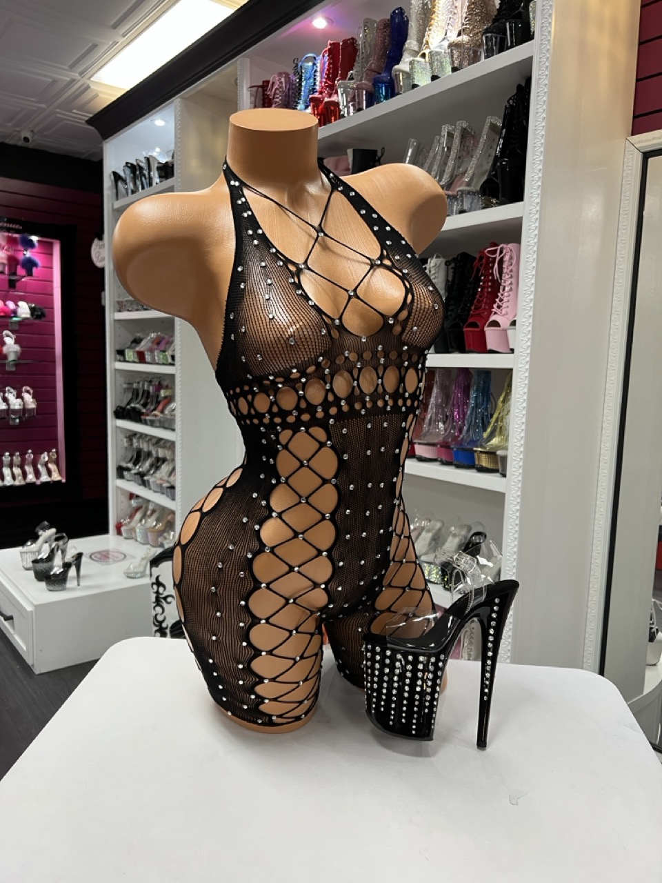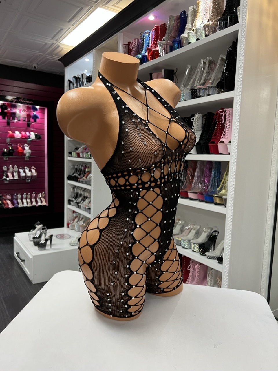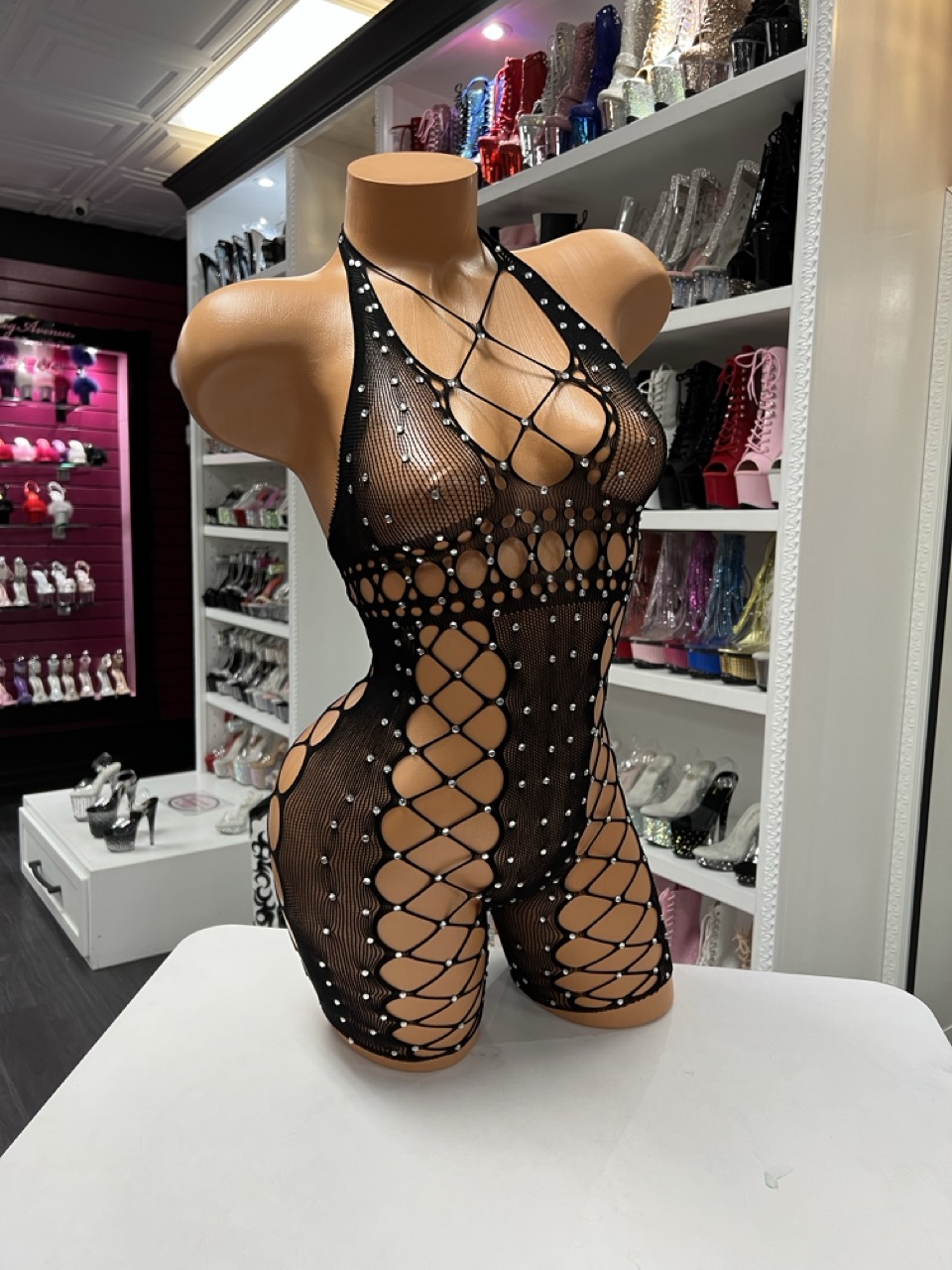 Black rhinestone net romper with bold cutout design and halter neckline. Stretchy, eye-catching, and designed for a standout look.