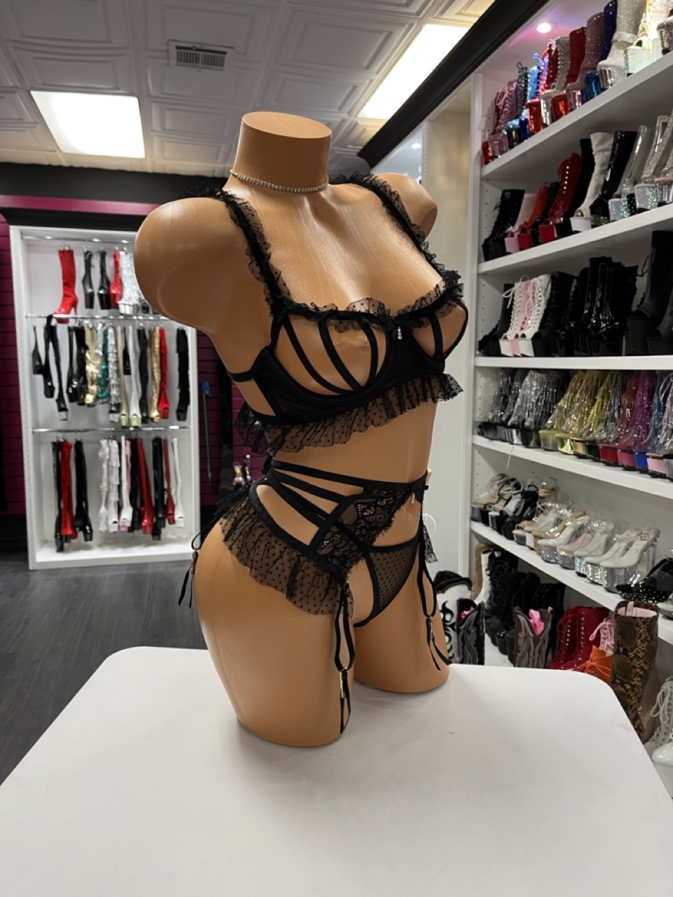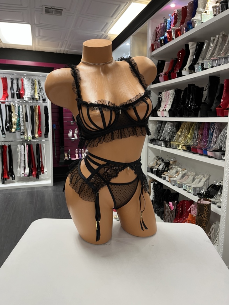 Sheer black 3-piece lingerie set with ruffle trim, strappy cage details, and attached garters. Flirty, bold, and stage-ready.