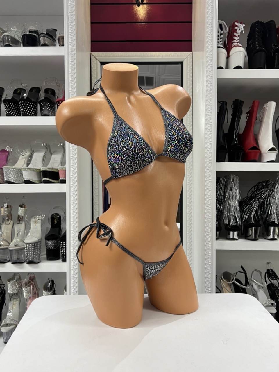 Black sequin bikini set with adjustable triangle top and tie-side bottoms. Sparkly, bold, and perfect for stage or nightlife.