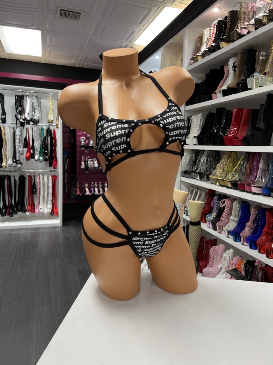 A bold, breathable two-piece featuring graphic print fabric and strappy cutout details. Designed for dancers who want comfort, flexibility, and a standout silhouette on stage.
