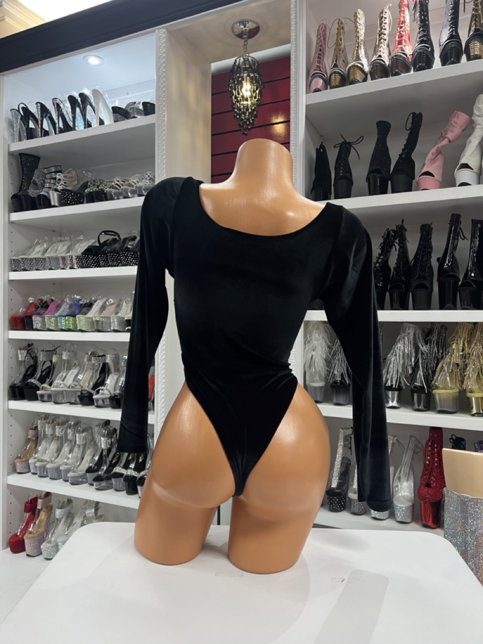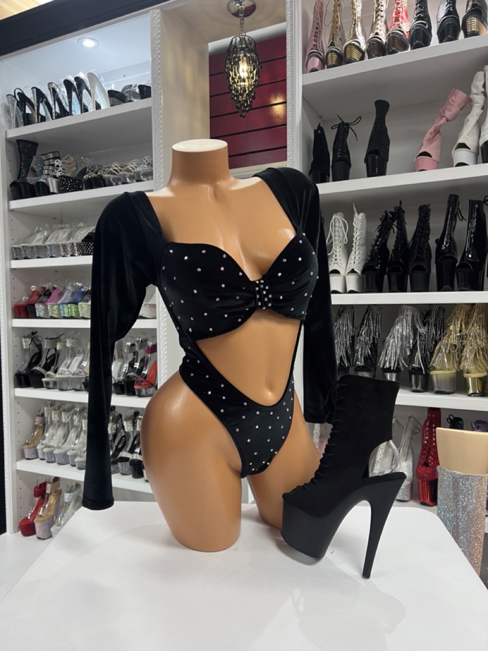 A luxurious black velvet cutout bodysuit with sparkling rhinestones and long sleeves. This stretchy design offers bold stage presence with smooth, comfortable movement.