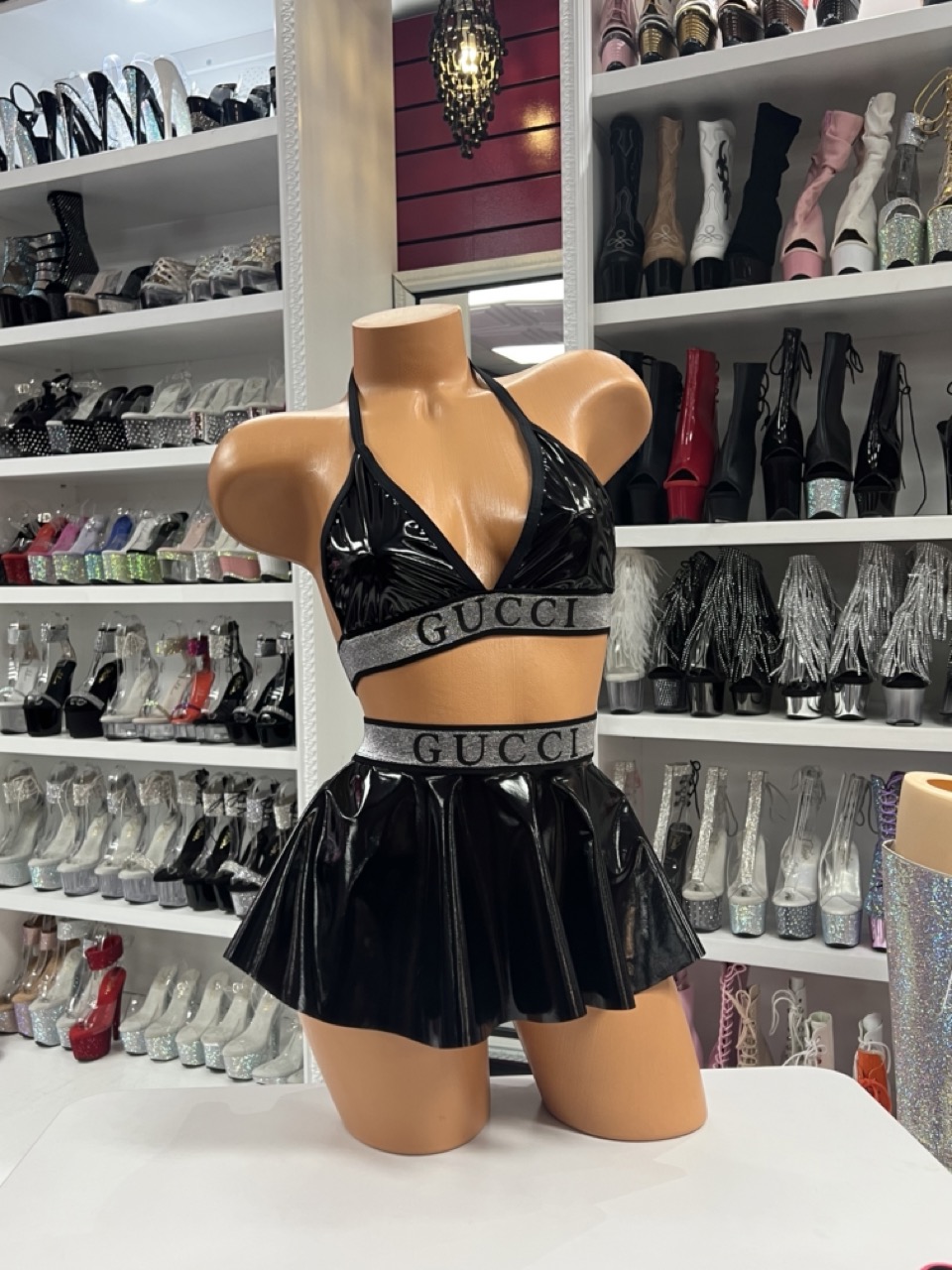 Black Vinyl Skirt Set with halter top and flared mini skirt