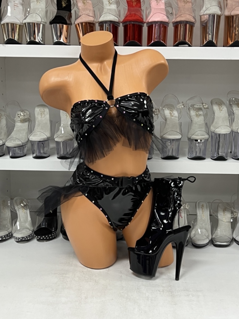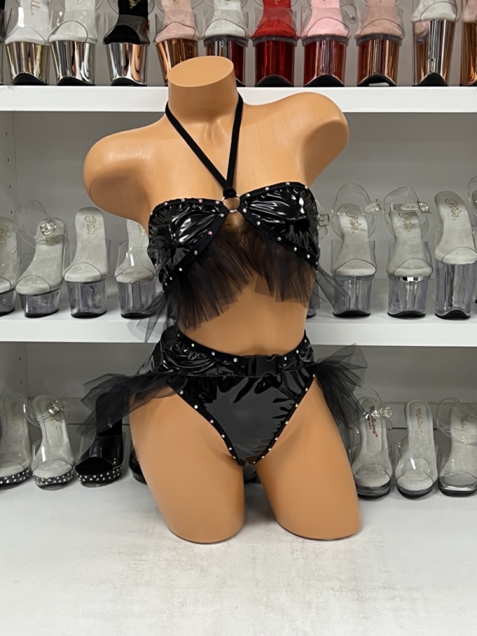 Shine bright in the Black Vinyl Tulle Set — includes halter top and high-waist bottoms with tulle accents for a bold, glossy statement look.
