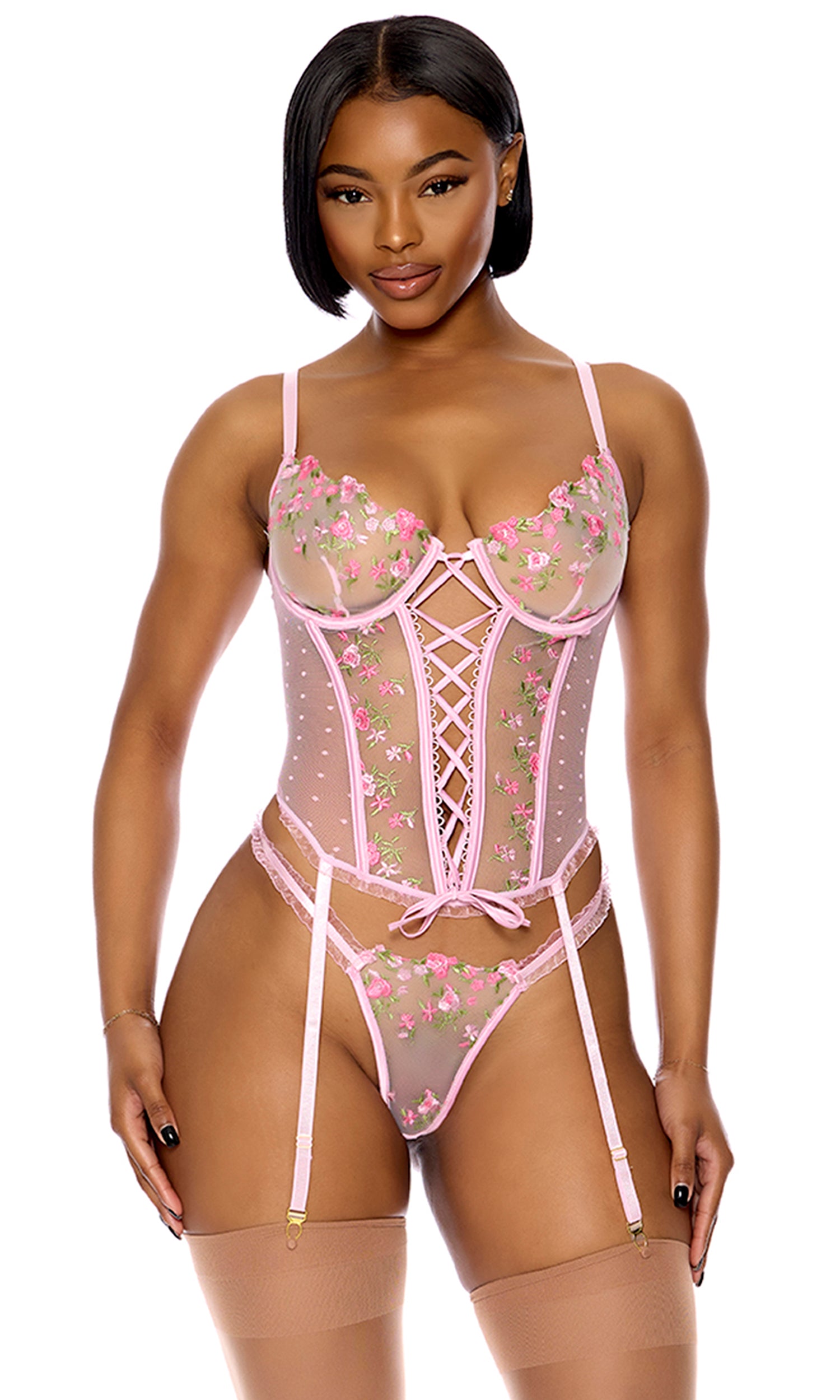 2-piece embroidered flower lace-up bustier with garters and matching panty set with ruffle trim and polka dot contrast mesh.