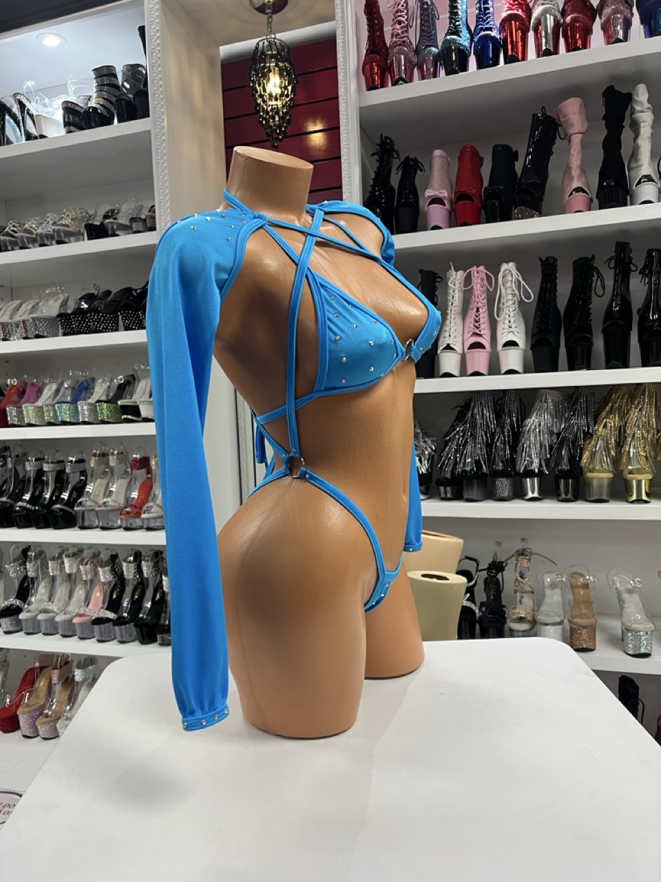 This blue crystal sleeve sling includes a sling bodysuit and matching sleeves. Perfect for performers, stage wear, and bold styling.