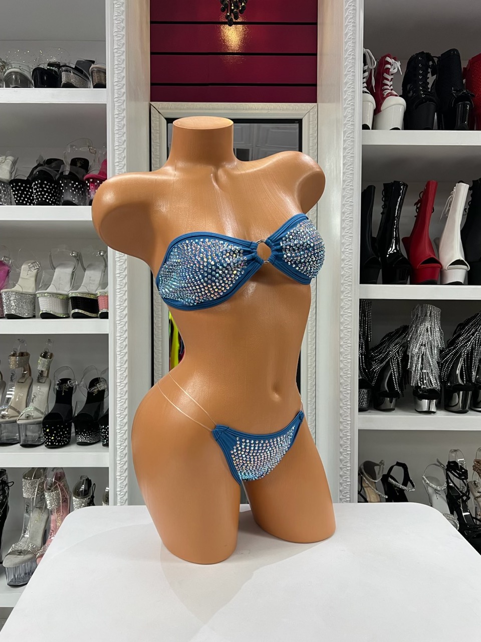 Blue Crystal Strap Bikini features sparkling crystal embellishments on a sleek bandeau design. This micro bikini creates a bold, curve-enhancing look with radiant shine.
