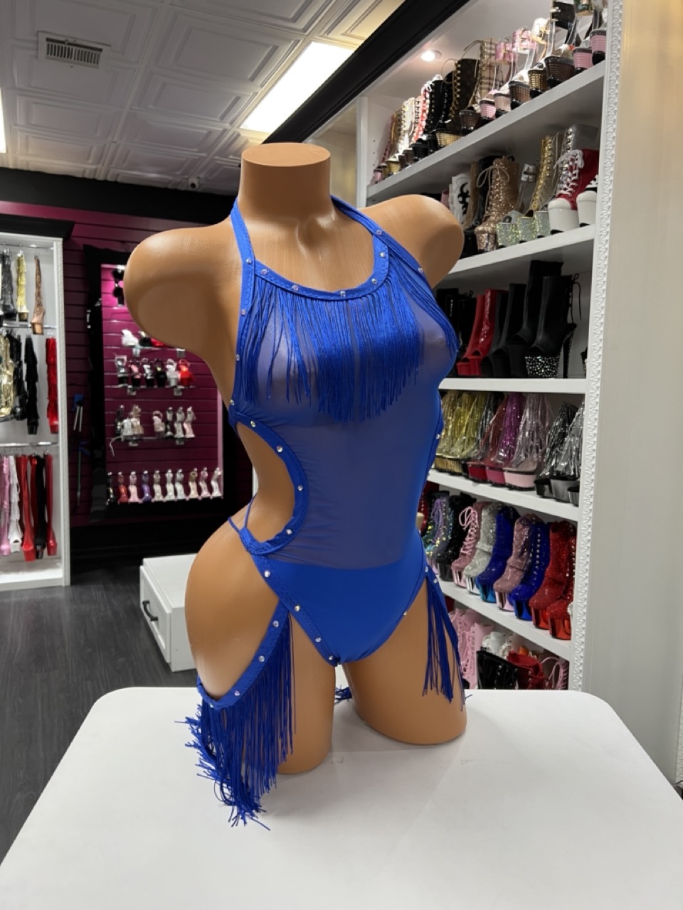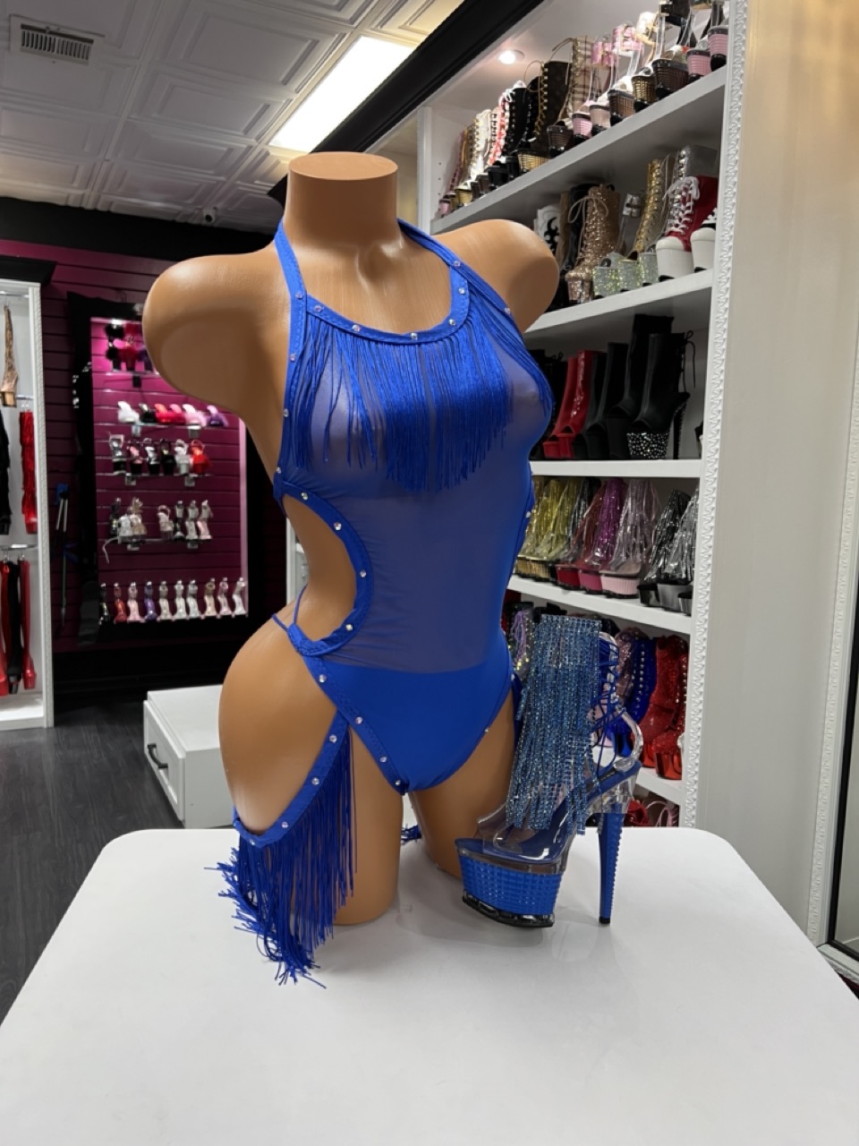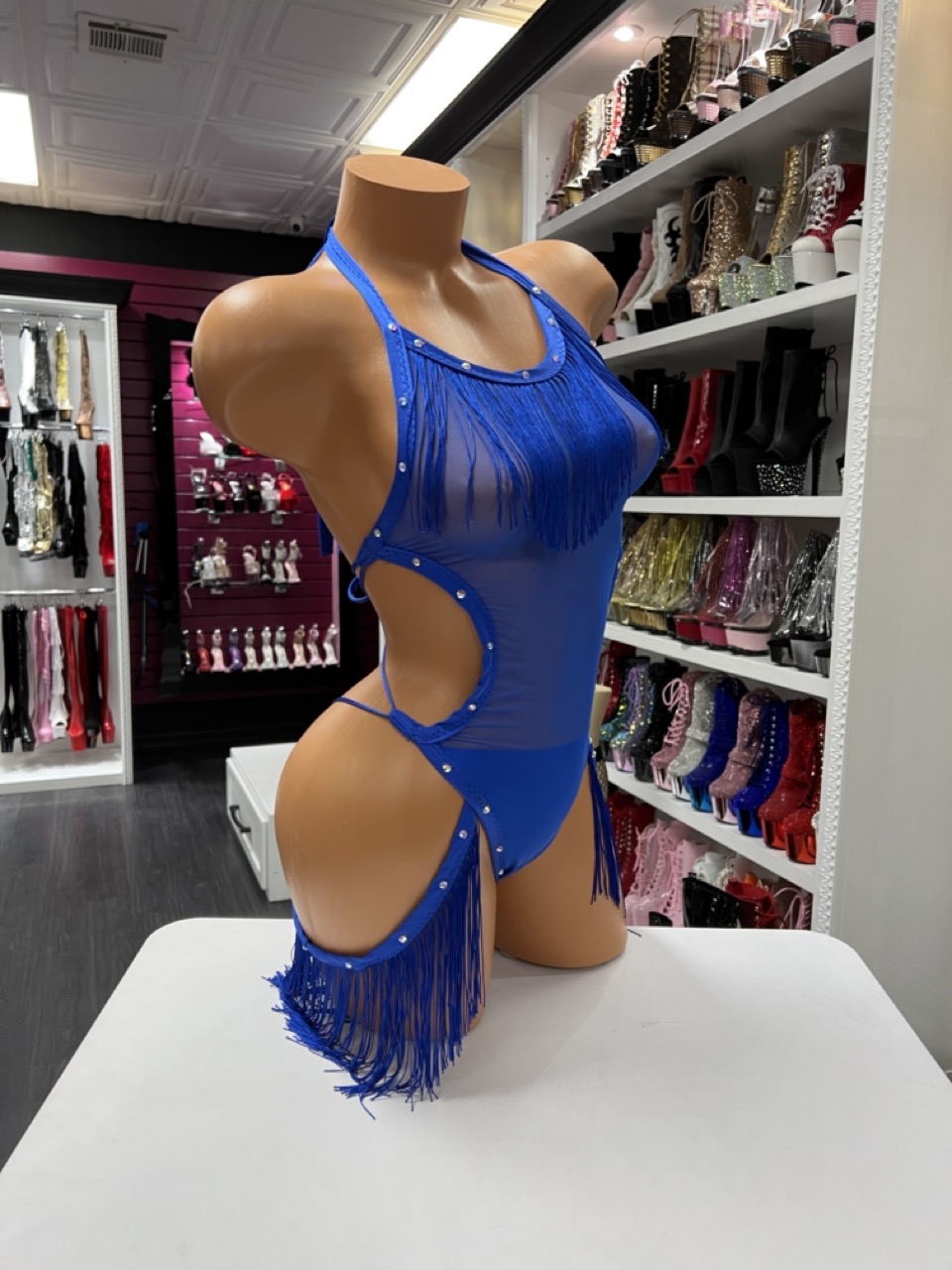 A bold blue cutout bodysuit with dramatic fringe and rhinestone accents. Designed for dancers who want movement, sparkle, and confident stage presence.