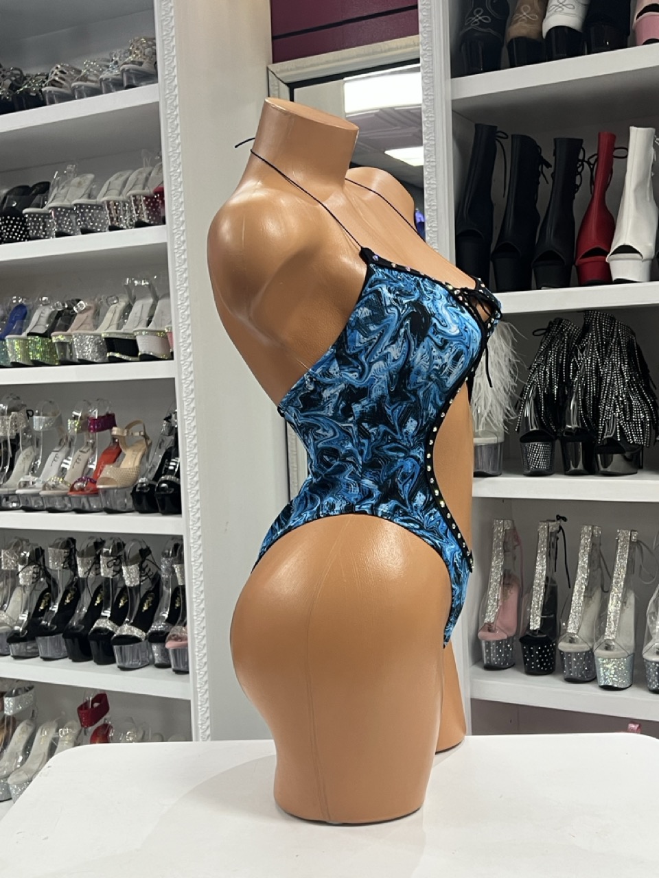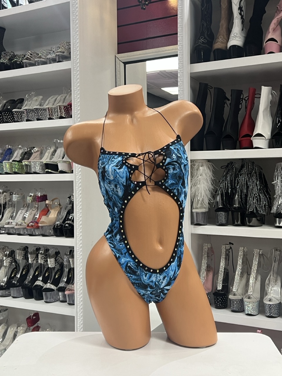 Blue Marble Cutout Bodysuit with lace-up neckline, studded trim, and bold print. Comfortable stretch fit for parties, stage, or club wear.