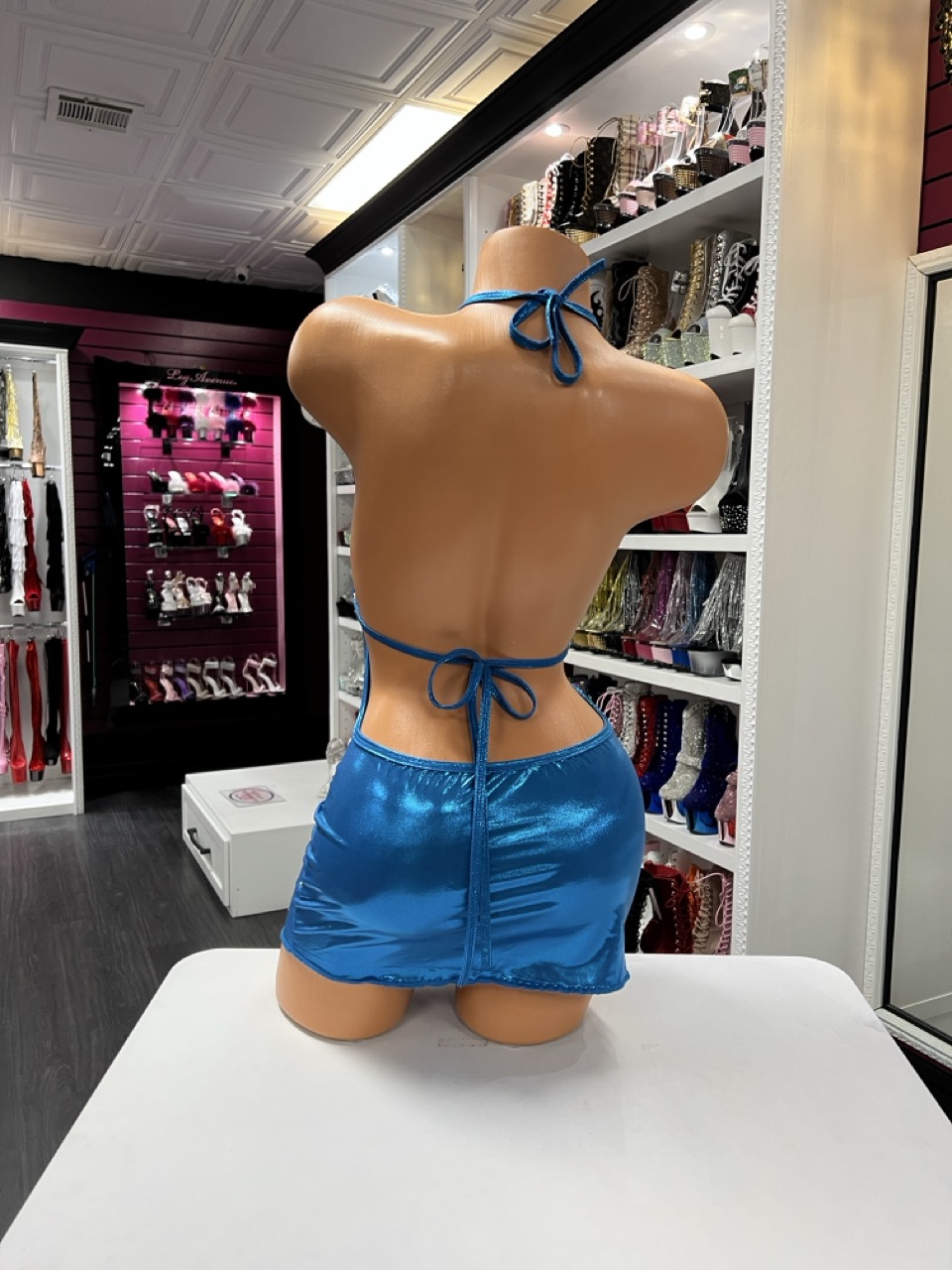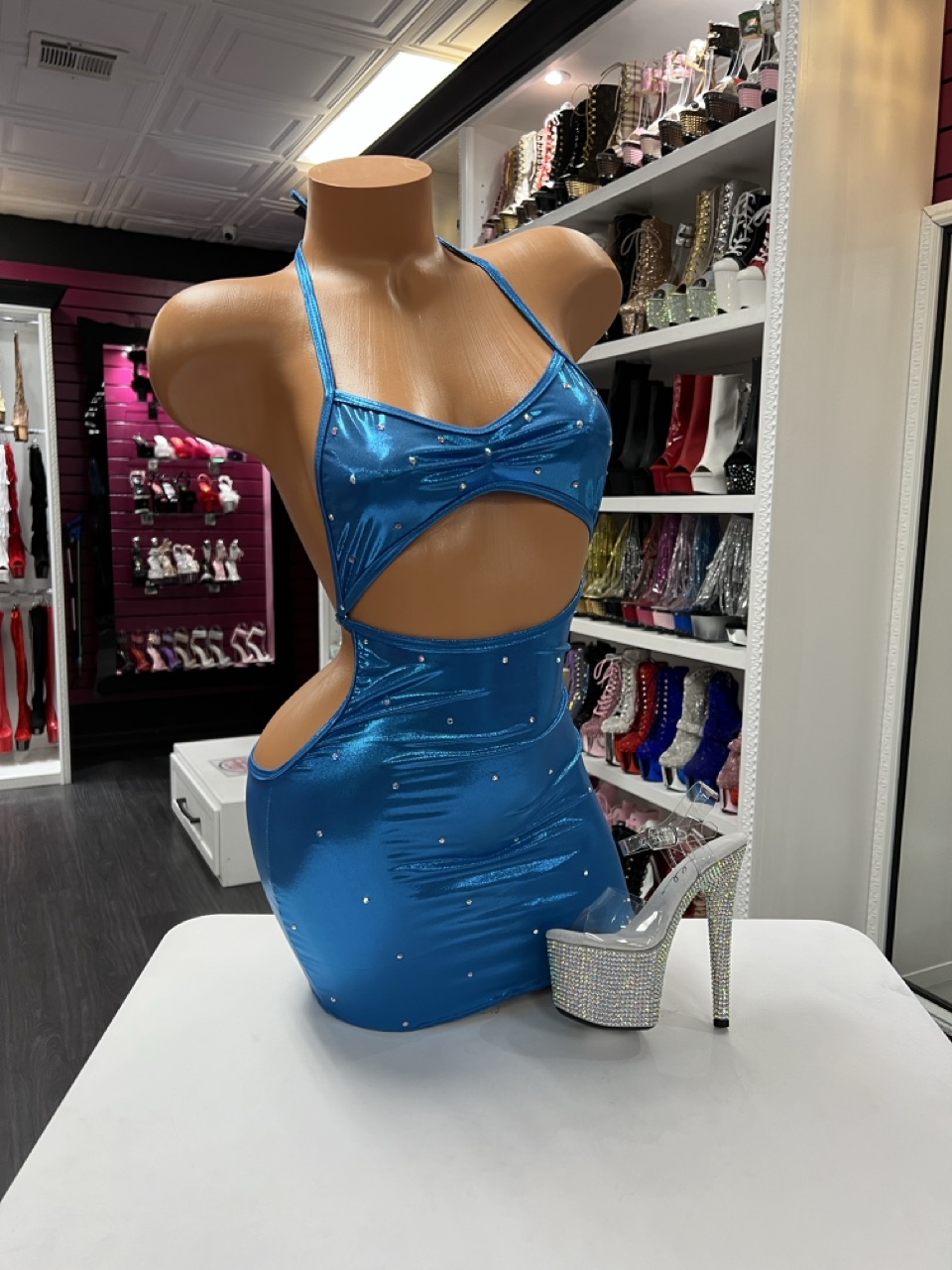 Metallic blue halter mini dress with rhinestone accents and a bold side cutout. Designed for standout shine and confident movement.