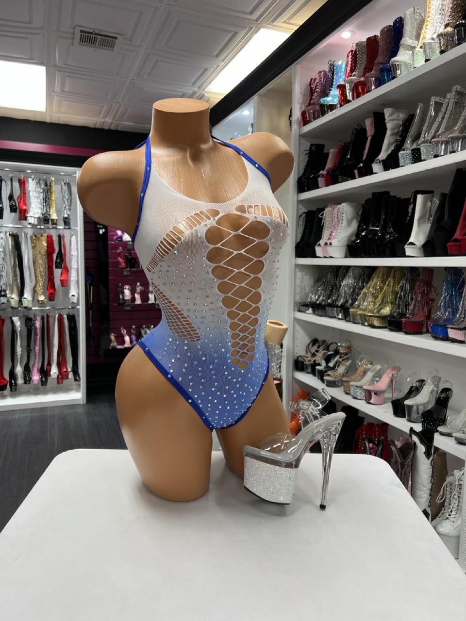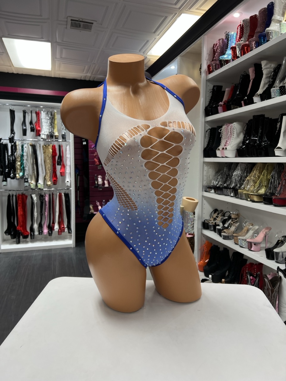 Crystal fishnet bodysuit featuring a stunning blue ombre gradient and halter neckline design. Sparkling crystal accents enhance stage presence and performer confidence.