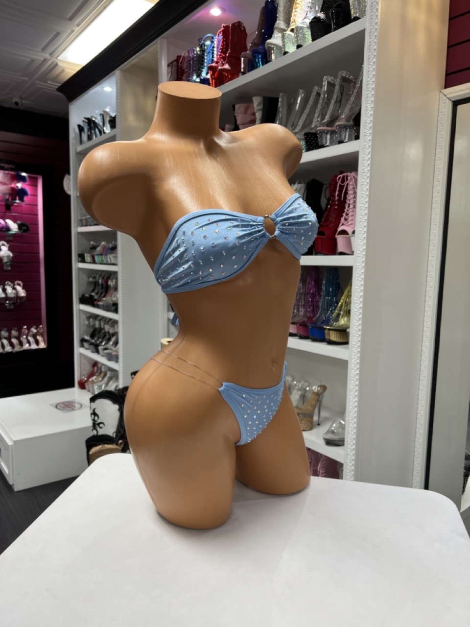 Blue rhinestone bikini set with bandeau top and thong