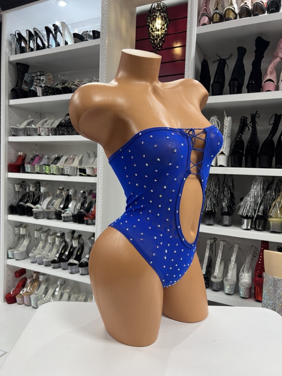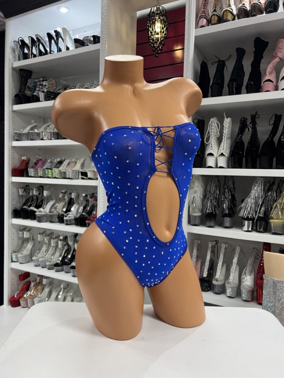 A bold royal blue lace-up rhinestone bodysuit with a dramatic cut-out and soft stretch fabric. Perfect for dancers, nightlife, and high-impact photo shoots.