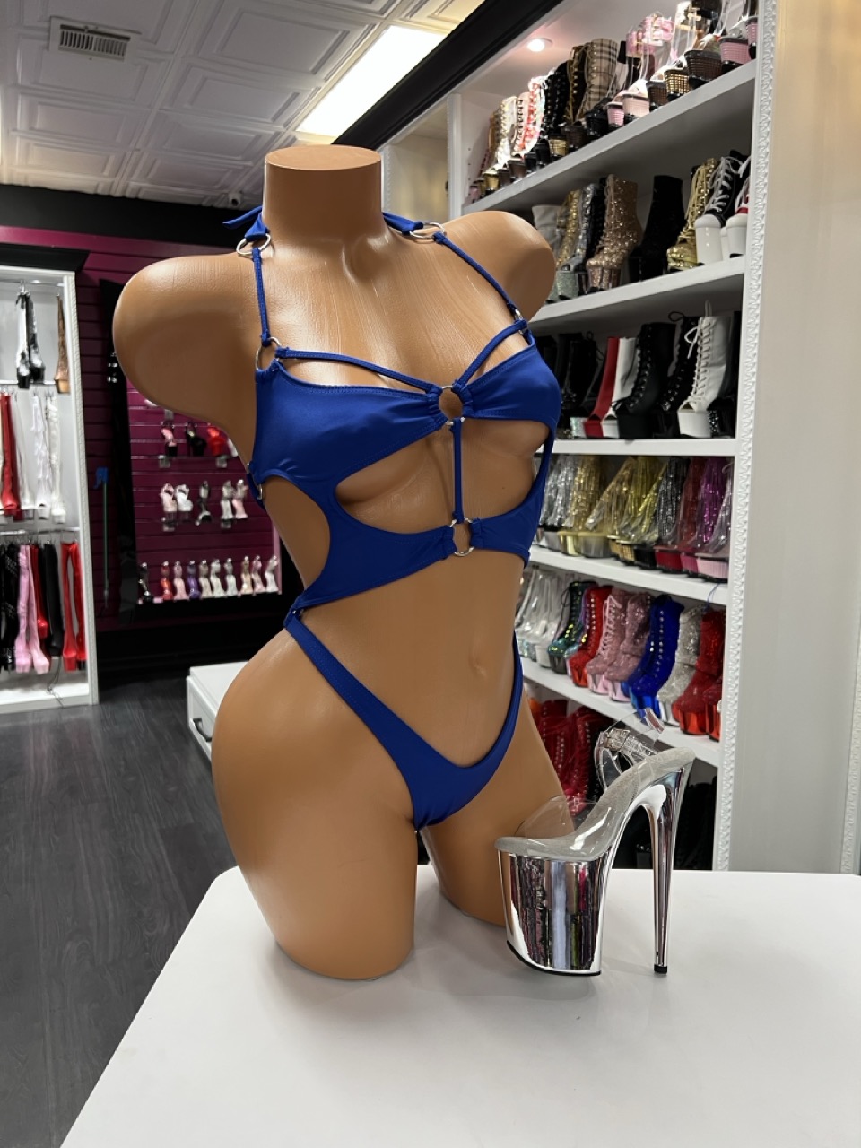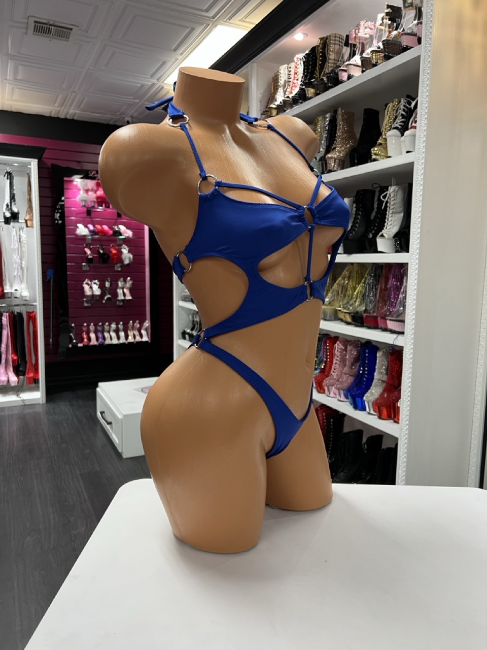 The vibrant royal blue fabric shines under stage lights and flatters every skin tone. With its cutout design, high-cut hips, and thong back, it highlights your curves while keeping you comfortable. Adjustable straps and metal ring details give you a secure fit with an extra touch of modern edge.