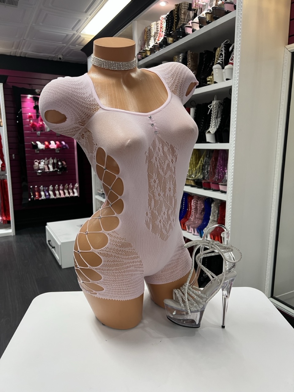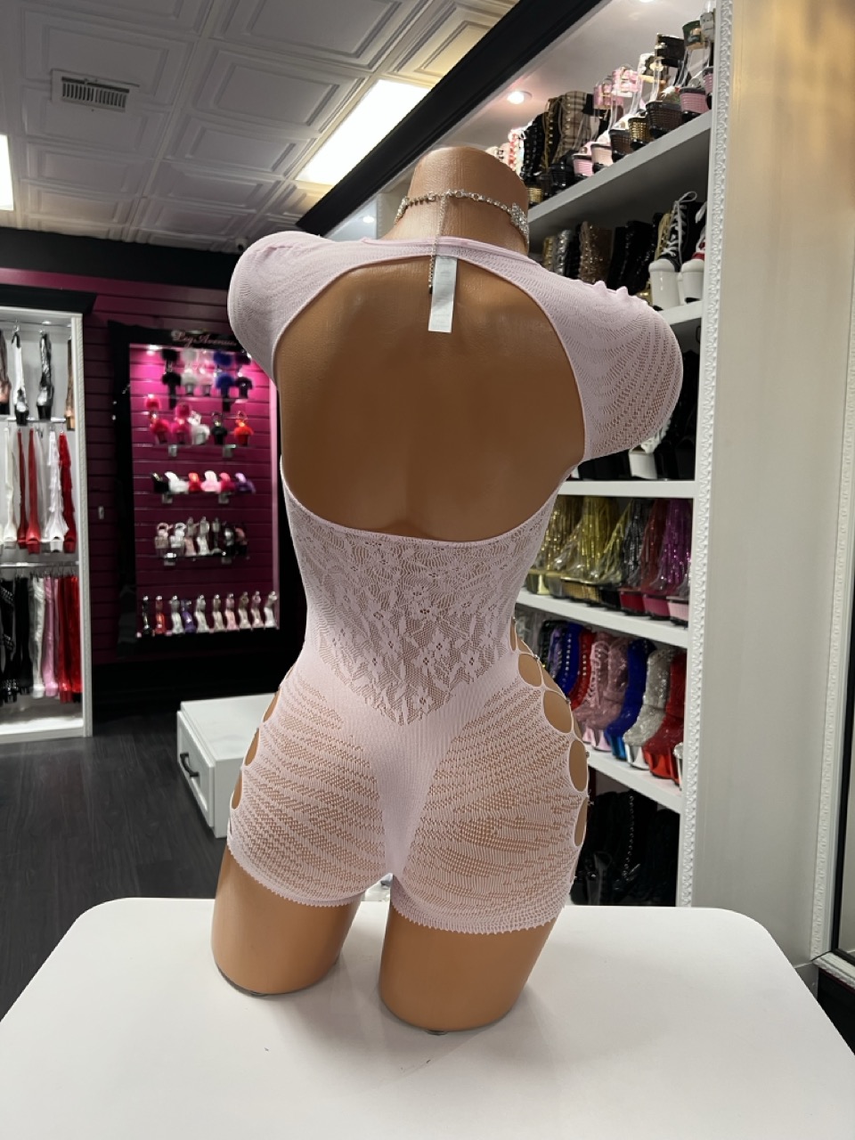 Serve bold curves and soft energy in this blush cutout romper. Made from ultra-stretchy mesh, it features lace panels down the center, flirty hip cutouts, and a sweet button accent at the bust. This piece is perfect for performers, dancers, or anyone ready to own the room with confidence.
